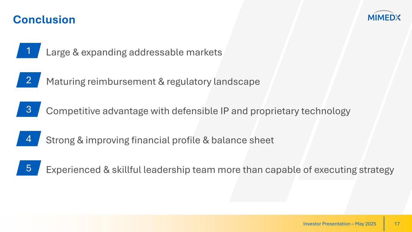 Experienced, Skillful Leadership Team Executing Strategy Investor Presentation – May 2025 Prior Roles Include: Management Team with Track Record of Success in MedTech Joe Capper Chief Executive Officer Doug Rice Chief Financial Officer Butch Hulse Chief Administrative Officer & General Counsel Kim Moller Chief Commercial Officer Ricci Whitlow Chief Operating Officer John Harper, Ph.D. Chief Scientific Officer & SVP, R&D Matt Notarianni Head of IR 16