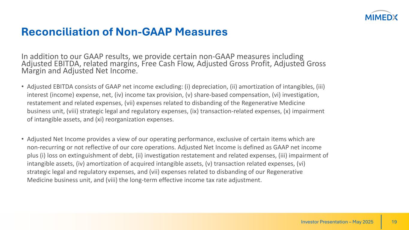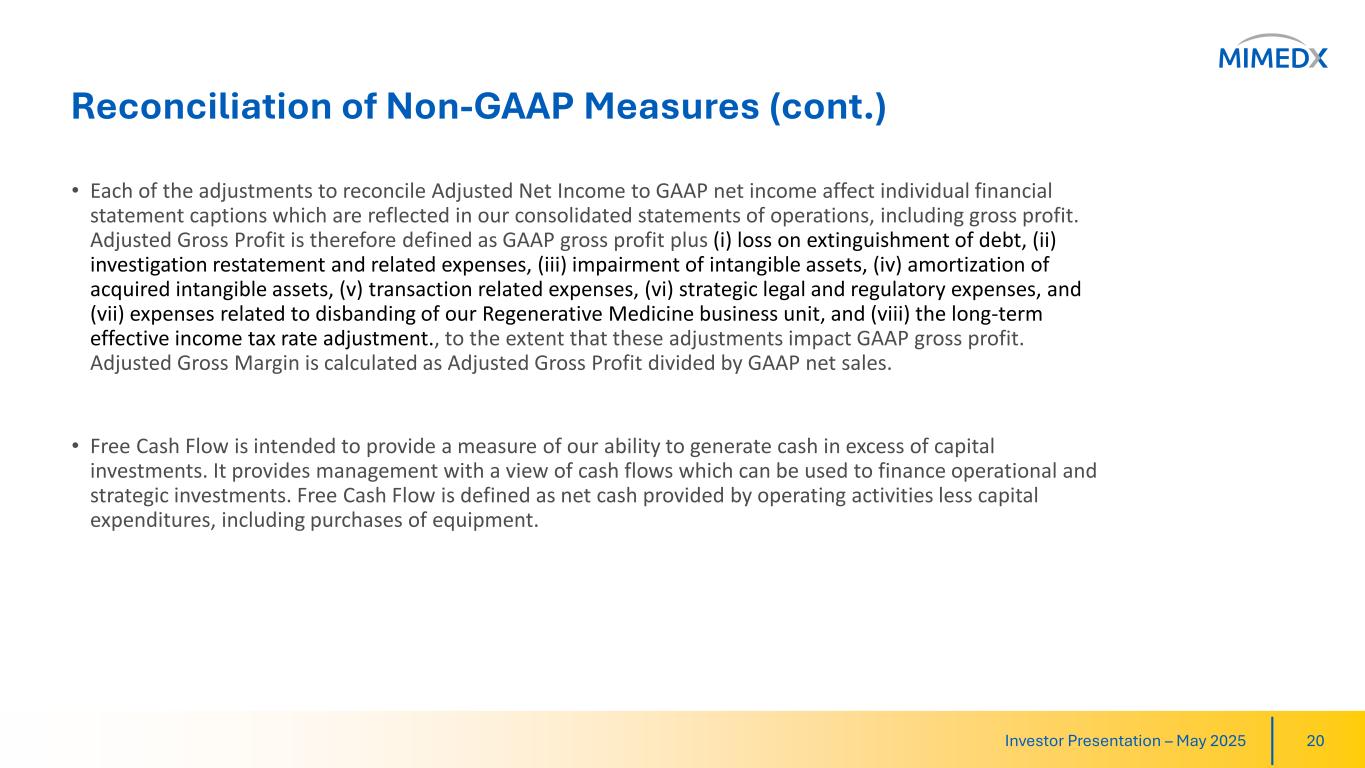 Reconciliation of Non-GAAP Measures In addition to our GAAP results, we provide certain non-GAAP measures including Adjusted EBITDA, related margins, Free Cash Flow, Adjusted Gross Profit, Adjusted Gross Margin and Adjusted Net Income. • Adjusted EBITDA consists of GAAP net income excluding: (i) depreciation, (ii) amortization of intangibles, (iii) interest (income) expense, net, (iv) income tax provision, (v) share-based compensation, (vi) investigation, restatement and related expenses, (vii) expenses related to disbanding of the Regenerative Medicine business unit, (viii) strategic legal and regulatory expenses, (ix) transaction-related expenses, (x) impairment of intangible assets, and (xi) reorganization expenses. • Adjusted Net Income provides a view of our operating performance, exclusive of certain items which are non-recurring or not reflective of our core operations. Adjusted Net Income is defined as GAAP net income plus (i) loss on extinguishment of debt, (ii) investigation restatement and related expenses, (iii) impairment of intangible assets, (iv) amortization of acquired intangible assets, (v) transaction related expenses, (vi) strategic legal and regulatory expenses, and (vii) expenses related to disbanding of our Regenerative Medicine business unit, and (viii) the long-term effective income tax rate adjustment. Investor Presentation – May 2025 19