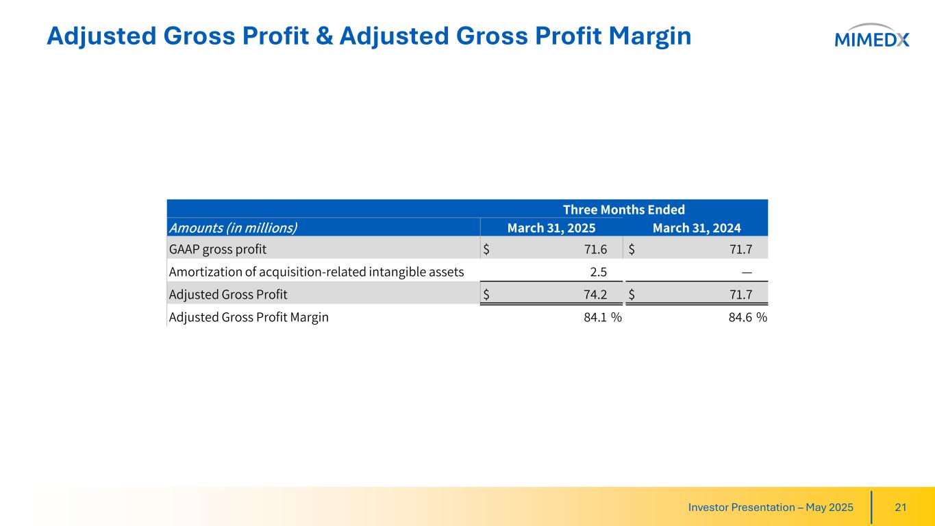 Reconciliation of Non-GAAP Measures (cont.) • Each of the adjustments to reconcile Adjusted Net Income to GAAP net income affect individual financial statement captions which are reflected in our consolidated statements of operations, including gross profit. Adjusted Gross Profit is therefore defined as GAAP gross profit plus (i) loss on extinguishment of debt, (ii) investigation restatement and related expenses, (iii) impairment of intangible assets, (iv) amortization of acquired intangible assets, (v) transaction related expenses, (vi) strategic legal and regulatory expenses, and (vii) expenses related to disbanding of our Regenerative Medicine business unit, and (viii) the long-term effective income tax rate adjustment., to the extent that these adjustments impact GAAP gross profit. Adjusted Gross Margin is calculated as Adjusted Gross Profit divided by GAAP net sales. • Free Cash Flow is intended to provide a measure of our ability to generate cash in excess of capital investments. It provides management with a view of cash flows which can be used to finance operational and strategic investments. Free Cash Flow is defined as net cash provided by operating activities less capital expenditures, including purchases of equipment. Investor Presentation – May 2025 20