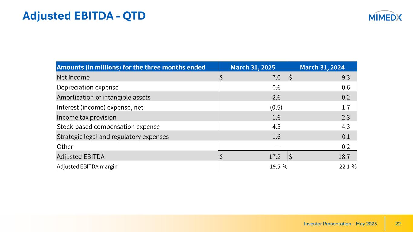 Adjusted Gross Profit & Adjusted Gross Profit Margin 21Investor Presentation – May 2025 Three Months Ended Amounts (in millions) March 31, 2025 March 31, 2024 GAAP gross profit $ 71.6 $ 71.7 Amortization of acquisition-related intangible assets 2.5 — Adjusted Gross Profit $ 74.2 $ 71.7 Adjusted Gross Profit Margin 84.1 % 84.6 %