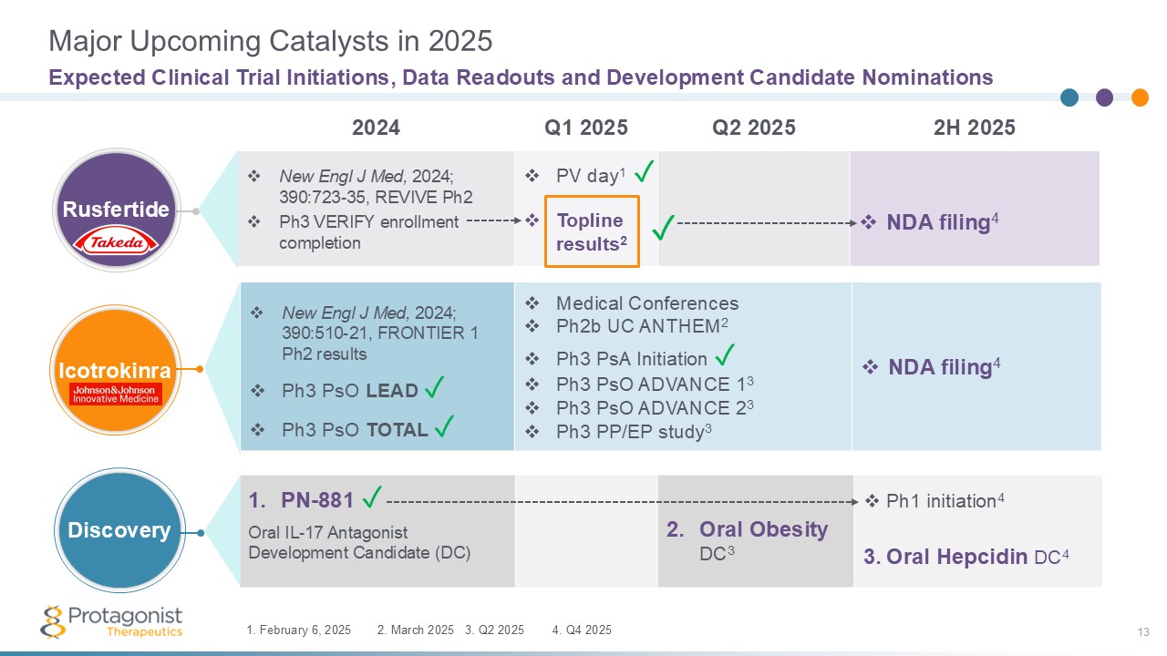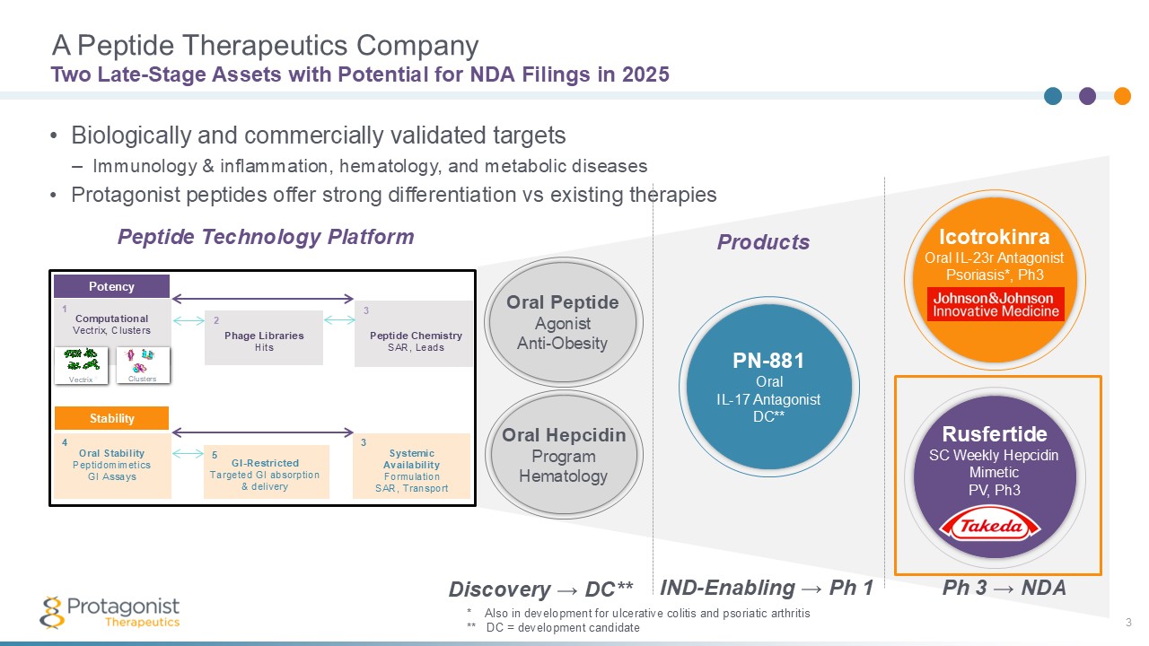 Forward - looking Statements 2 This presentation and the accompanying oral presentation contain forward - looking statements made pursuant to the safe harbor pro visions of the Private Securities Litigation Reform Act of 1995. All statements other than statements of historical facts contained in this presentation, inclu din g statements regarding the potential benefits of rusfertide , timing of rusfertide clinical trial data publication and regulatory submissions, our expectations our future results of operations and financial position, business strategy, product candidates, capital resources, potential markets for our product candidates, our plans a nd expectations related to the impact on our business or product candidates of actions or determinations of the U.S. Food and Drug Administration (“FDA”), our collabo rat ion with Johnson & Johnson Innovation, Inc. (”JNJ”), our collaboration with Takeda, our IL - 17 and other discovery and pre - clinical programs including expectations regarding announcements related to those programs, our potential receipt of milestone payments and royalties under our collaboration agreements with JNJ and Takeda, and the timing of icotrokinra ( JNJ - 2113, formerly PN - 235) and rusfertide clinical results, Janssen’s development plan for icotrokinra, and the potential marke t opportunity for rusfertide and icotrokinra , are forward - looking statements. In some cases, you can identify forward - looking statements by terminology such as “anticipate, ” “believe,” “continue,” “could,” “estimate,” “expect,” “intend,” “may,” “plan,” “potentially,” “predict,” “should,” “will,” or the negative of these ter ms or other similar expressions. The forward - looking statements made in this presentation involve known and unknown risks, uncertainties and other important fact ors that may cause our actual results, performance or achievements to be materially different from any future results, performance or achievements expresse d o r implied by the forward - looking statements. These forward - looking statements are subject to risks and uncertainties, including those discussed in Protagonist’s filings with the Securities and Exchange Commission, including in the “Risk Factors” and “Management’s Discussion and Analysis of Financial Condition and Res ult s of Operations” sections of most recently filed periodic reports on Form 10 - K and Form 10 - Q and subsequent filings and in the documents incorporated by refe rence therein. Because forward - looking statements are inherently subject to risks and uncertainties, some of which cannot be predicted or quantified and som e o f which are beyond our control, you should not rely on these forward - looking statements as predictions of future events. The events and circumstances reflected in o ur forward - looking statements may not be achieved or occur and actual results could differ materially from those projected in the forward - looking statements. Exce pt as required by applicable law, we do not plan to publicly update or revise any forward - looking statements contained herein, whether as a result of any new informatio n, future events, changed circumstances or otherwise. This presentation concerns products that are under clinical investigation and which have not yet been approved for marketing by the FDA. They are currently limited by Federal law to investigational use, and no representation is made as to their safety or effectiveness for the purposes for wh ich they are being investigated. The trademarks included herein are the property of the owners thereof and are used for reference purposes only. Such use should not be construed as an endorsement of such products. Nothing contained in this presentation is, or should be construed as, a recommendation, promise or representat ion by the presenter or Protagonist or any director, employee, agent or advisor of Protagonist. This presentation does not purport to be all inclusive or to contain al l the information you may desire.
