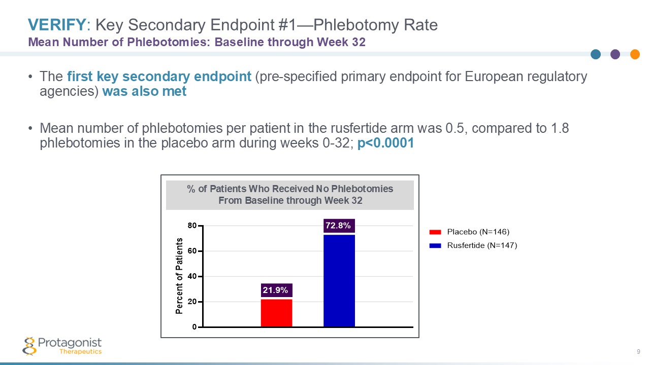 8 The primary endpoint was met – Significantly higher proportion of clinical responders 1 among rusfertide - treated PV patients ( 77% ) compared to those who received placebo ( 33% ) during weeks 20 - 32; p<0.0001 VERIFY : Primary Efficacy Endpoint — Response Rate 1 Definition of “clinical response”: • completed weeks 0 - 32 of the study • was not phlebotomy eligible during weeks 20 - 32 • did not receive a phlebotomy during weeks 20 - 32 Responders (Week 20 through Week 32) 0 20 40 60 80 P e r c e n t o f P a t i e n t s W i t h R e s p o n s e Placebo (N=146) Rusfertide (N=147) 32.9% 76.9% Phlebotomy Eligibility (Week 20 through Week 32)