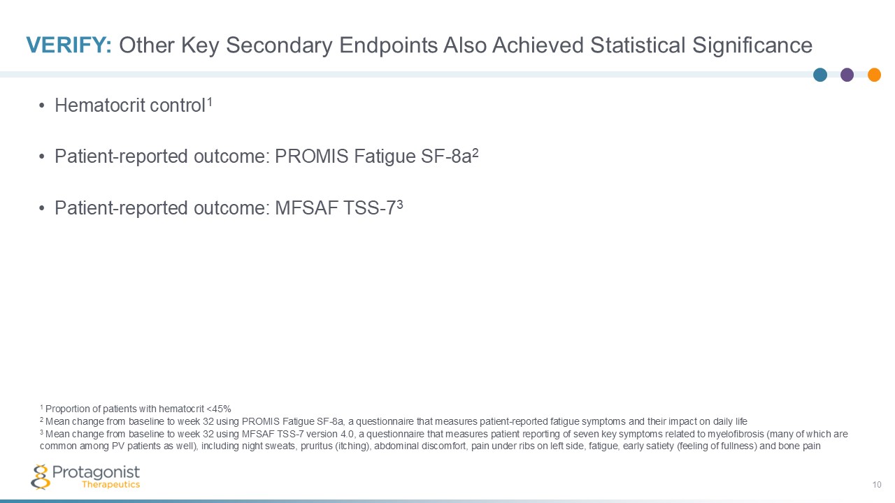 • The first key secondary endpoint (pre - specified primary endpoint for European regulatory agencies) was also met • Mean number of phlebotomies per patient in the rusfertide arm was 0.5, compared to 1.8 phlebotomies in the placebo arm during weeks 0 - 32; p<0.0001 VERIFY : Key Secondary Endpoint #1 — Phlebotomy Rate 9 % of Patients Who Received No Phlebotomies From Baseline through Week 32 0 20 40 60 80 P e r c e n t o f P a t i e n t s Placebo (N=146) Rusfertide (N=147) 21.9% 72.8% Mean Number of Phlebotomies: Baseline through Week 32