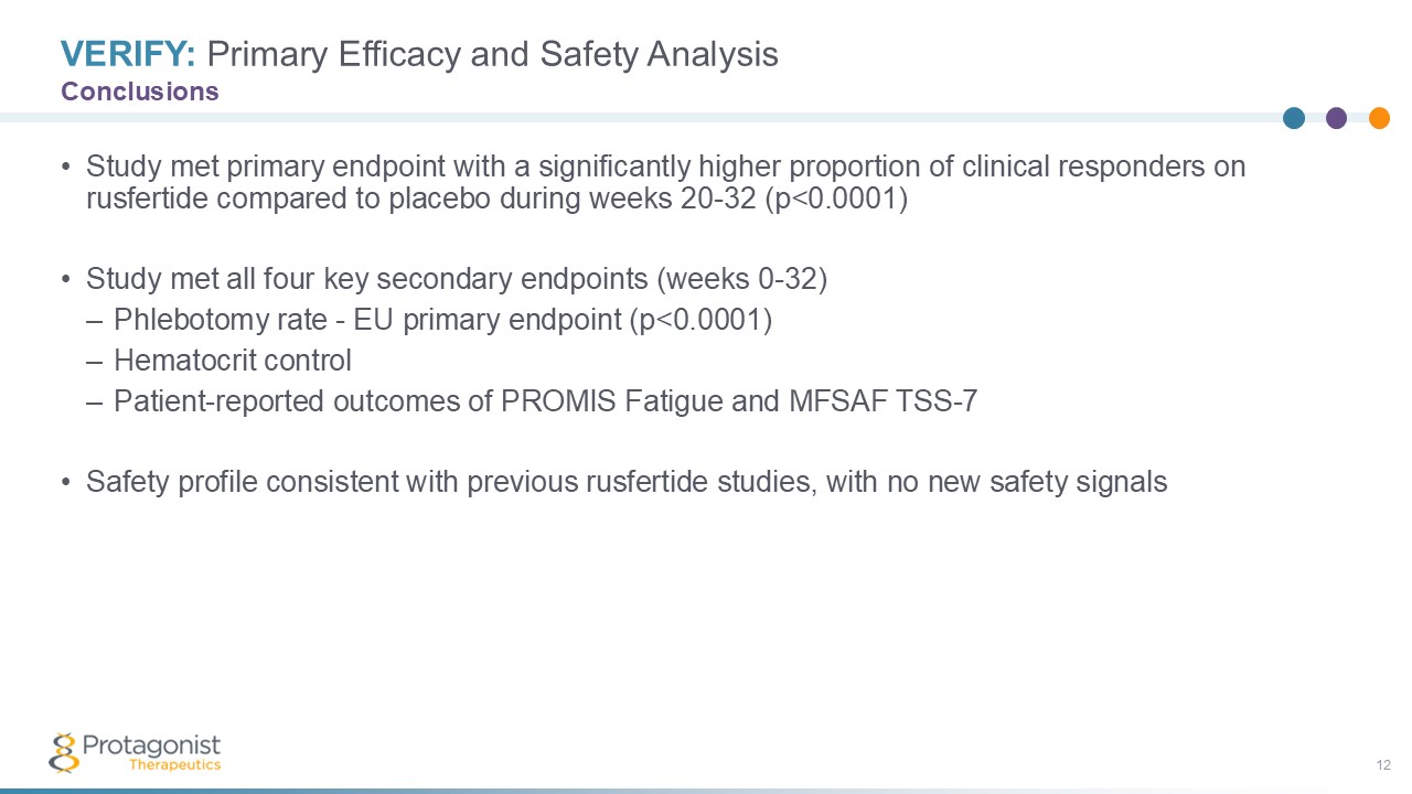 VERIFY: Overall Summary of Adverse Events (Weeks 0 - 32) 11 • Rusfertide was generally well tolerated • Safety data were in line with other rusfertide clinical studies; no new safety findings were observed • Majority of adverse events were grade 1 - 2 injection site reactions • All serious adverse events reported were deemed to be not drug - related • N o evidence of increased risk of cancer in rusfertide - treated patients compared to placebo