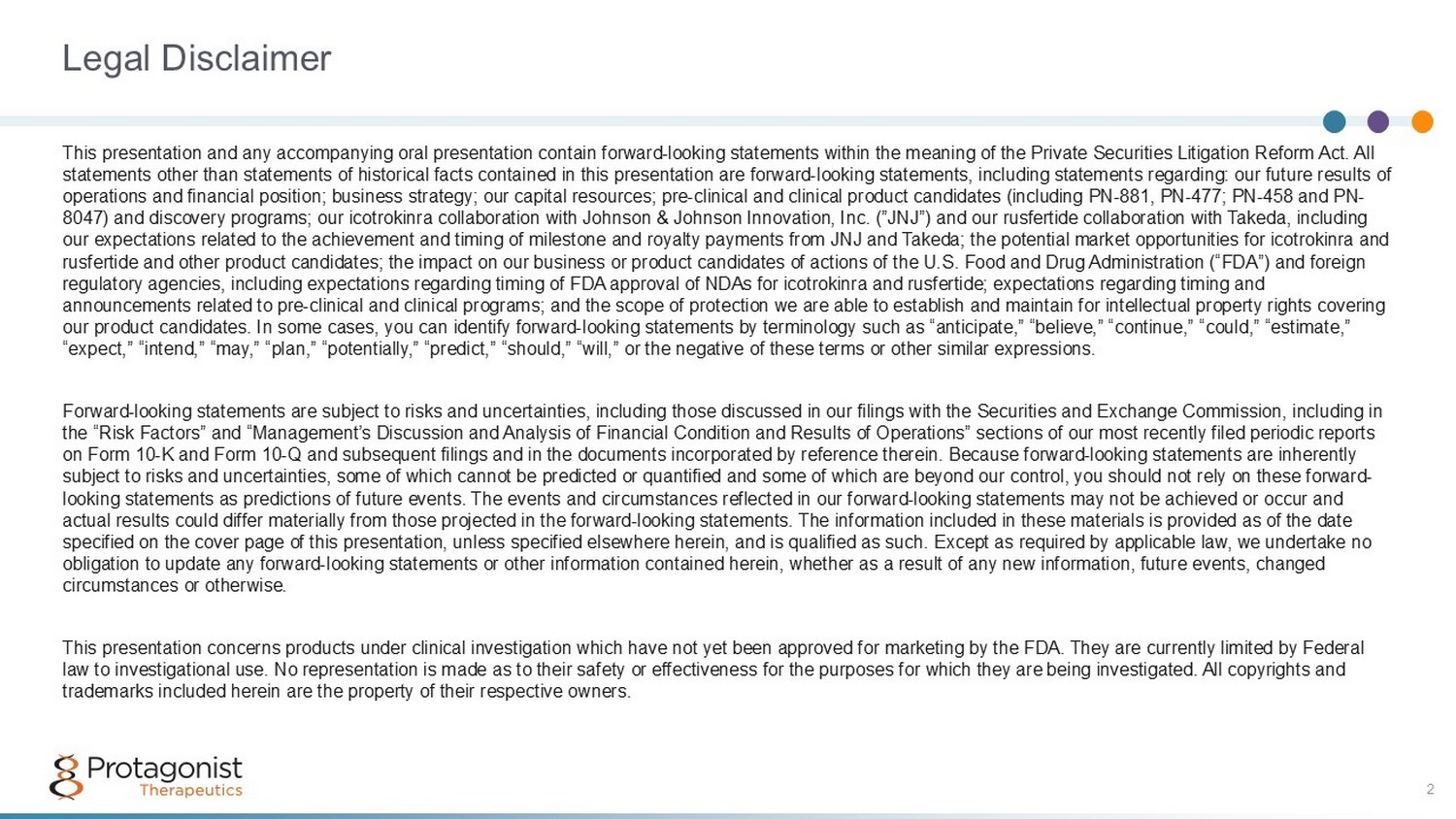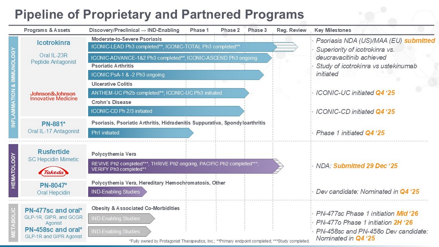 Major Upcoming Catalysts in 2026 - 2027 53 Expected Clinical Trial Initiations, Data Readouts, and Development Candidate Nominations 2027 2H 2026 1H 2026 PN - 8047* PN - 458sc* PN - 458o* PN - 477sc* PN - 477o* PN - 881* Icotrokinra Rusfertide Discovery* *Fully owned by Protagonist Therapeutics, Inc . DC, Development candidate; ready for IND - enabling studies. □ Commercial □ US approval/launch for PV □ Opt - in/Opt - out decision □ NDA submitted □ Commercial □ US approval/launch for Psoriasis □ Ph3 ICONIC - PsA 1 Primary Completion □ Psoriasis NDA & MAA □ Ph3 PsA 1 & 2; UC & CD ongoing □ Ph2 PsO Interim Analysis □ Ph2 PsO Initiation □ Ph1 Topline □ PK/PD data Oral IL - 17 antagonist □ Ph1 ongoing □ Ph1 Topline □ PN - 477sc Ph1 clinical PoC □ PN - 477o Ph1 initiation □ PN - 477sc Ph1 initiation Anti - obesity DCs □ IND - enabling studies □ Ph1 Topline □ Ph1 initiation □ Oral Hepcidin DC □ Ph1 initiation Dual GLP/GIP DCs □ PN - 458sc □ PN - 458o □ AmylinR - based mono & poly - agonists □ Oral IL - 4R antagonist