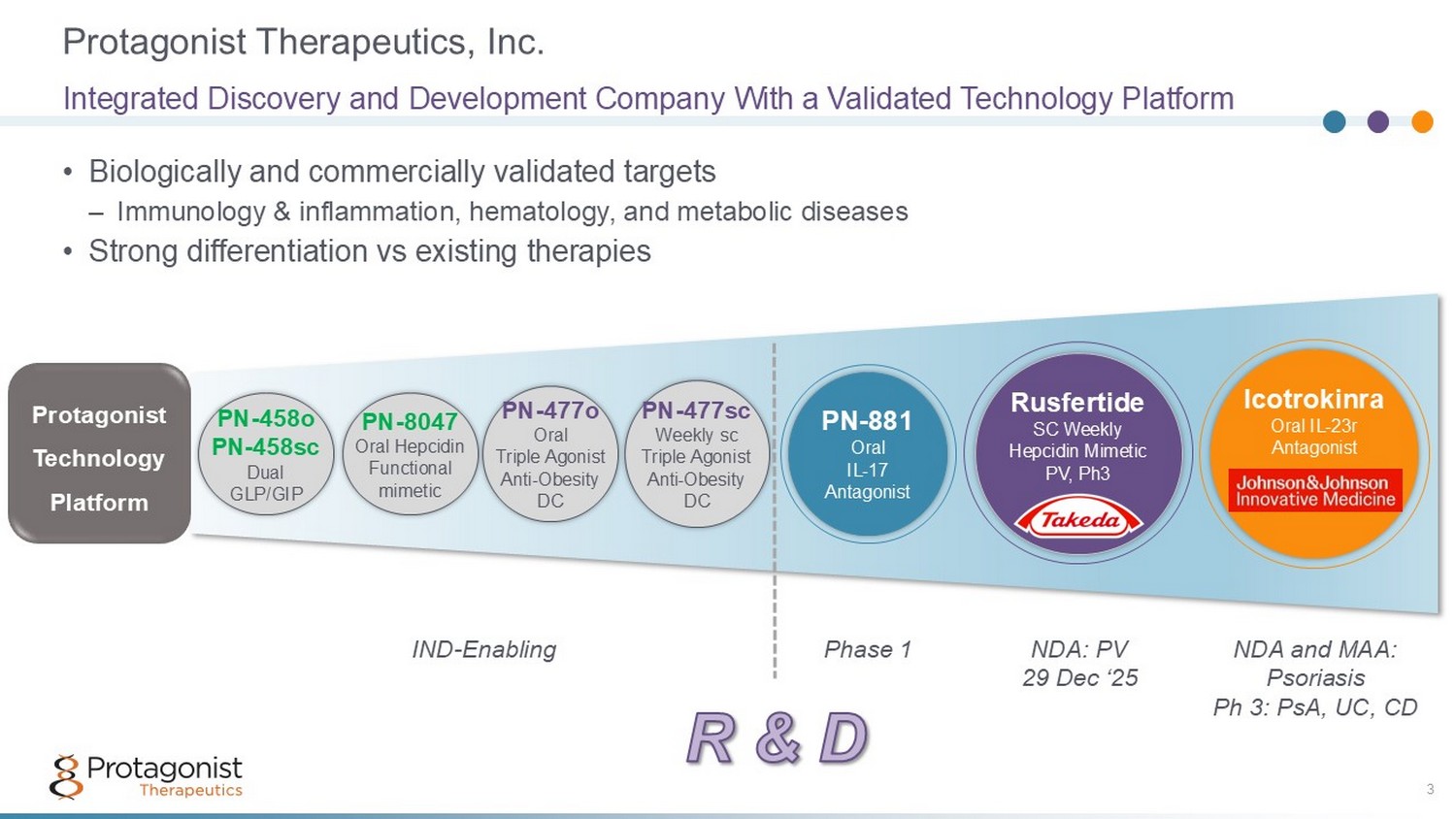 Legal Disclaimer This presentation and any accompanying oral presentation contain forward - looking statements within the meaning of the Private Se curities Litigation Reform Act. All statements other than statements of historical facts contained in this presentation are forward - looking statements, including st atements regarding: our future results of operations and financial position; business strategy; our capital resources; pre - clinical and clinical product candidates (inclu ding PN - 881, PN - 477; PN - 458 and PN - 8047) and discovery programs; our icotrokinra collaboration with Johnson & Johnson Innovation, Inc. (”JNJ”) and our rusfertid e c ollaboration with Takeda, including our expectations related to the achievement and timing of milestone and royalty payments from JNJ and Takeda; the potential m ark et opportunities for icotrokinra and rusfertide and other product candidates; the impact on our business or product candidates of actions of the U.S. Food and Dru g A dministration (“FDA”) and foreign regulatory agencies, including expectations regarding timing of FDA approval of NDAs for icotrokinra and rusfertide; expectat ion s regarding timing and announcements related to pre - clinical and clinical programs; and the scope of protection we are able to establish and maintain f or intellectual property rights covering our product candidates. In some cases, you can identify forward - looking statements by terminology such as “anticipate,” “believe ,” “continue,” “could,” “estimate,” “expect,” “intend,” “may,” “plan,” “potentially,” “predict,” “should,” “will,” or the negative of these terms or other simila r e xpressions. Forward - looking statements are subject to risks and uncertainties, including those discussed in our filings with the Securities and Exchange Commission, including in the “Risk Factors” and “Management’s Discussion and Analysis of Financial Condition and Results of Operations” sections of ou r m ost recently filed periodic reports on Form 10 - K and Form 10 - Q and subsequent filings and in the documents incorporated by reference therein. Because forward - lookin g statements are inherently subject to risks and uncertainties, some of which cannot be predicted or quantified and some of which are beyond our control, yo u should not rely on these forward - looking statements as predictions of future events. The events and circumstances reflected in our forward - looking statements may not be achieved or occur and actual results could differ materially from those projected in the forward - looking statements. The information included in these materials is provided as of the date specified on the cover page of this presentation, unless specified elsewhere herein, and is qualified as such. Except as requ ire d by applicable law, we undertake no obligation to update any forward - looking statements or other information contained herein, whether as a result of any new inform ation, future events, changed circumstances or otherwise. This presentation concerns products under clinical investigation which have not yet been approved for marketing by the FDA. T hey are currently limited by Federal law to investigational use. No representation is made as to their safety or effectiveness for the purposes for which they are be ing investigated. All copyrights and trademarks included herein are the property of their respective owners. 2