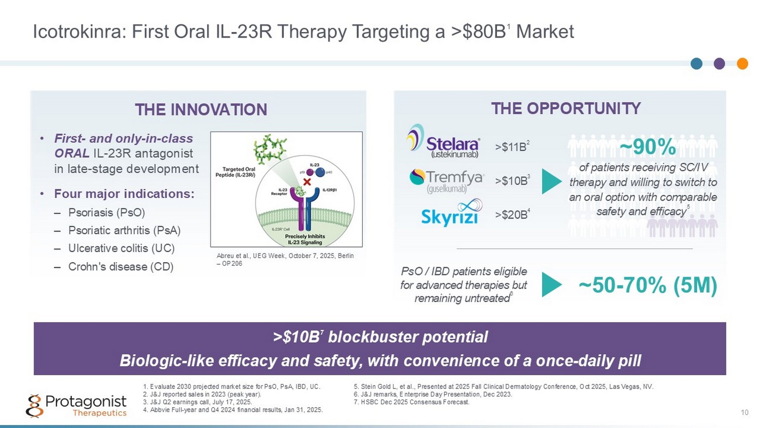 Icotrokinra: First Oral IL - 23R Therapy Targeting a >$80B 1 Market 10 >$10B 7 blockbuster potential Biologic - like efficacy and safety, with convenience of a once - daily pill WW market Size 2030 est. (7 - yr CAGR) 1 THE OPPORTUNITY of patients receiving SC/IV therapy and willing to switch to an oral option with comparable safety and efficacy 5 ~90% WW market Size 2030 est. (7 - yr CAGR) 1 THE INNOVATION >$20B 4 1. Evaluate 2030 projected market size for PsO, PsA, IBD, UC. 2. J&J reported sales in 2023 (peak year). 3. J&J Q2 earnings call, July 17, 2025. 4. Abbvie Full - year and Q4 2024 financial results, Jan 31, 2025. >$11B 2 PsO / IBD patients eligible for advanced therapies but remaining untreated 6 ~50 - 70% (5M) >$10B 3 • First - and only - in - class ORAL IL - 23R antagonist in late - stage development • Four major indications: – Psoriasis (PsO) – Psoriatic arthritis (PsA) – Ulcerative colitis (UC) – Crohn's disease (CD) 5 . Stein Gold L, et al., Presented at 2025 Fall Clinical Dermatology Conference, Oct 2025, Las Vegas, NV. 6. J&J remarks, Enterprise Day Presentation, Dec 2023. 7. HSBC Dec 2025 Consensus Forecast. Abreu et al., UEG Week, October 7, 2025, Berlin – OP206