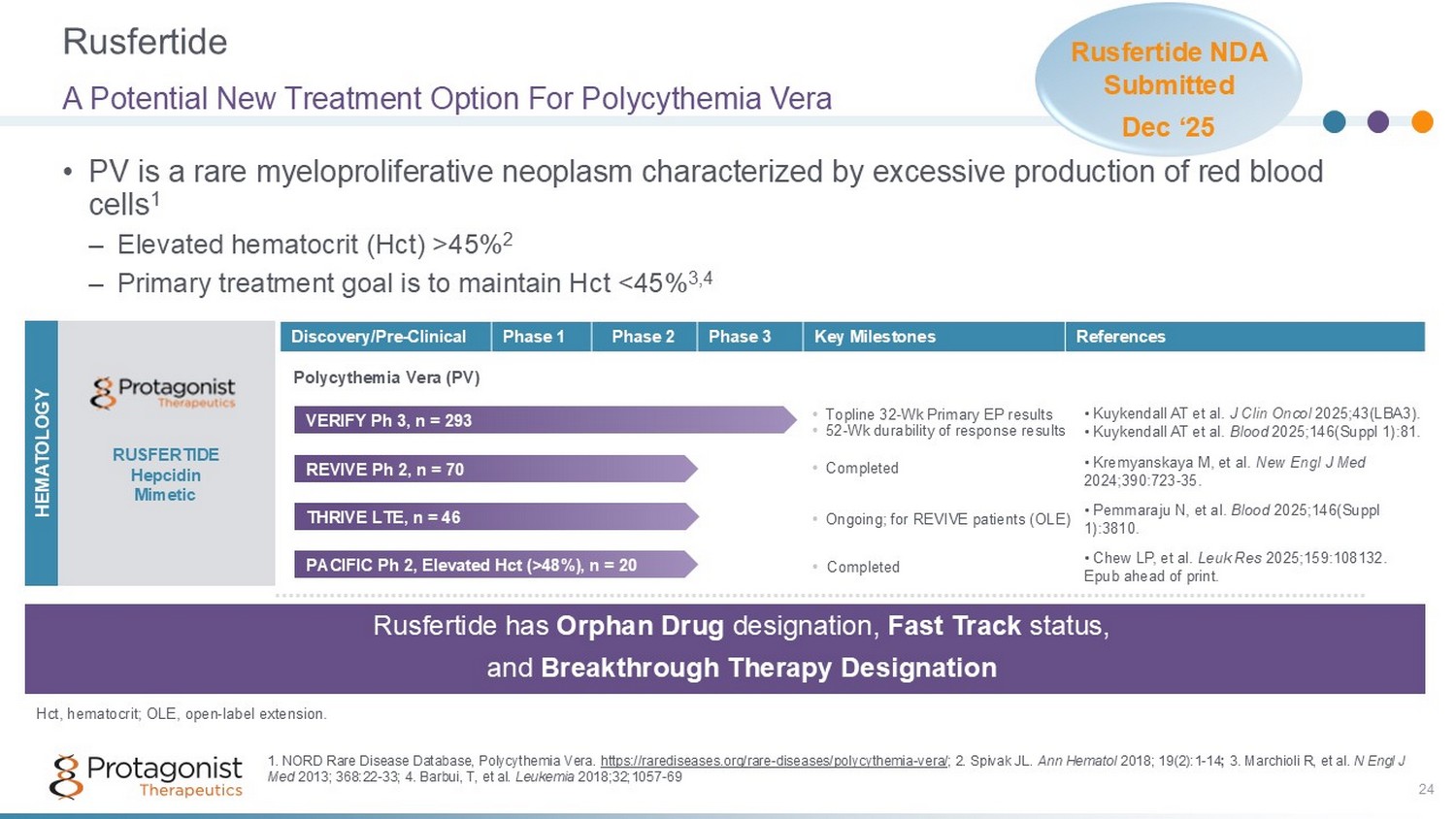 Rusfertide 24 • PV is a rare myeloproliferative neoplasm characterized by excessive production of red blood cells 1 – Elevated hematocrit (Hct) >45% 2 – Primary treatment goal is to maintain Hct <45% 3,4 A Potential New Treatment Option For Polycythemia Vera References Key Milestones Phase 3 Phase 2 Phase 1 Discovery/Pre - Clinical RUSFERTIDE Hepcidin Mimetic Polycythemia Vera (PV) HEMATOLOGY Rusfertide has Orphan Drug designation, Fast Track status, and Breakthrough Therapy Designation 1. NORD Rare Disease Database, Polycythemia Vera. https://rarediseases.org/rare - diseases/polycythemia - vera/ ; 2. Spivak JL. Ann Hematol 2018; 19(2):1 - 14 ; 3. Marchioli R, et al. N Engl J Med 2013; 368:22 - 33; 4. Barbui, T, et al. Leukemia 2018;32;1057 - 69 REVIVE Ph 2, n = 70 • C ompleted • Kremyanskaya M, et al. New Engl J Med 2024;390:723 - 35. PACIFIC Ph 2, Elevated Hct (>48%), n = 20 • Completed • Chew LP, et al. Leuk Res 2025;159:108132. Epub ahead of print. • Topline 32 - Wk Primary EP results • 52 - Wk durability of response results VERIFY Ph 3, n = 293 • Kuykendall AT et al. J Clin Oncol 2025;43(LBA3). • Kuykendall AT et al. Blood 2025;146(Suppl 1):81. THRIVE LTE, n = 46 • Ongoing; for REVIVE patients ( OLE) • Pemmaraju N, et al. Blood 2025;146(Suppl 1):3810. Hct, hematocrit; OLE, open - label extension. Rusfertide NDA Submitted Dec ‘ 25
