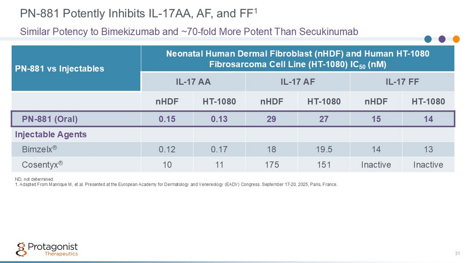 Criteria for Nomination of Oral PN - 881 Development Candidate 1 Criteria Attribute x Sub - nM potency vs. IL - 17 AA x Blocks all dimeric forms of IL - 17: AA, AF, FF Potency x Stable in simulated gastric and intestinal fluids x Stable in serum with t 1/2 >24 hr x Metabolic stability x Thermostability Stability x Oral exposure and half - life in rodent and higher species sufficient for oral daily dosing PK x Mouse hIL - 17 challenge, CXCL1 model PD model x Rat IL - 23 - induced skin inflammation model Efficacy Model Oral PN - 881 Achieved all the Criteria for a Development Candidate Nomination 1. Manrique M, et al. Presented at the European Academy for Dermatology and Venereology (EADV) Congress. September 17 - 20, 2025, Paris, France. 30