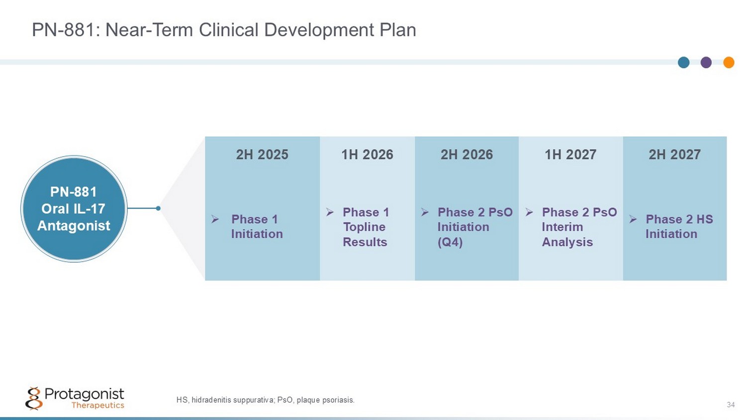 PN - 881: Comprehensive Phase 1 Study in Healthy Human Volunteers (N~142) 33 • Primary endpoint: – Incidence and severity of treatment - emergent adverse events (pre - dose to 7 days after last dose) • Secondary endpoints: – Pharmacokinetics and pharmacodynamics Part 3: Assessment of Solid Dose Formulations Part 5: Multiple Dose PK of Solid Dose Formulation Part 4: Effect of Food on Solid Dose Formulation Part 1: Single Ascending Dose (SAD) (Randomized to PN - 881 or Placebo) SAD Level 1 SAD Level 2 SAD Level 3 ●●● Part 2: Multiple Ascending Dose (MAD) (Randomized to PN - 881 or Placebo) MAD Level 1 MAD Level 2 MAD Level 3 ●●● Phase 1 completion by mid - year; Phase 2 Psoriasis study initiation by year end