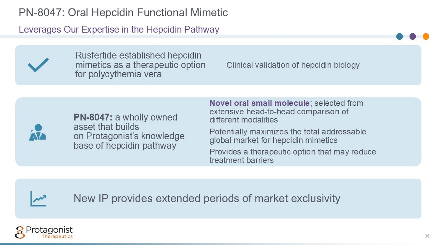 PN - 8047: Oral Hepcidin Functional Mimetic 36 Leverages Our Expertise in the Hepcidin Pathway Rusfertide established hepcidin mimetics as a therapeutic option for polycythemia vera Clinical validation of hepcidin biology PN - 8047: a wholly owned asset that builds on Protagonist’s knowledge base of hepcidin pathway Novel oral small molecule ; selected from extensive head - to - head comparison of different modalities Potentially maximizes the total addressable global market for hepcidin mimetics Provides a therapeutic option that may reduce treatment barriers New IP provides extended periods of market exclusivity