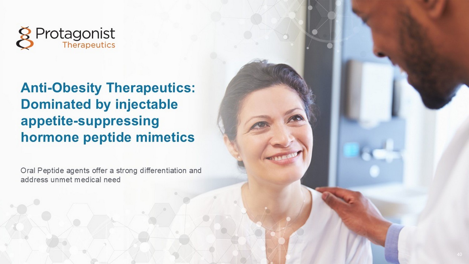 Anti - Obesity Therapeutics: Dominated by injectable appetite - suppressing hormone peptide mimetics Oral Peptide agents offer a strong differentiation and address unmet medical need 40