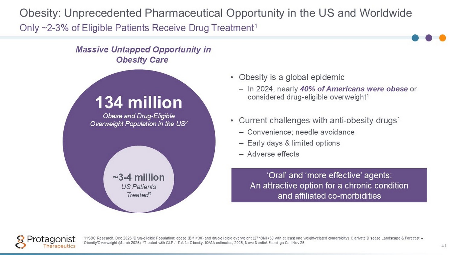 Obesity: Unprecedented Pharmaceutical Opportunity in the US and Worldwide • Obesity is a global epidemic – In 2024, nearly 40% of Americans were obese or considered drug - eligible overweight 1 • Current challenges with anti - obesity drugs 1 – Convenience; needle avoidance – Early days & limited options – Adverse effects Only ~2 - 3% of Eligible Patients Receive Drug Treatment 1 134 million Obese and Drug - Eligible Overweight Population in the US 2 ~3 - 4 million US Patients Treated 3 1 HSBC Research, Dec 2025 2 Drug - eligible Population: obese (BMI ≥ 30) and drug - eligible overweight (27 ≤ BMI<30 with at least one weight - related comorbidity) Clarivate Disease Landscape & Forecast – Obesity/Overweight (March 2025). 3 Treated with GLP - 1 RA for Obesity: IQVIA estimates, 2025; Novo Nordisk Earnings Call Nov 25 41 Massive Untapped Opportunity in Obesity Care ‘Oral’ and ‘more effective’ agents: An attractive option for a chronic condition and affiliated co - morbidities