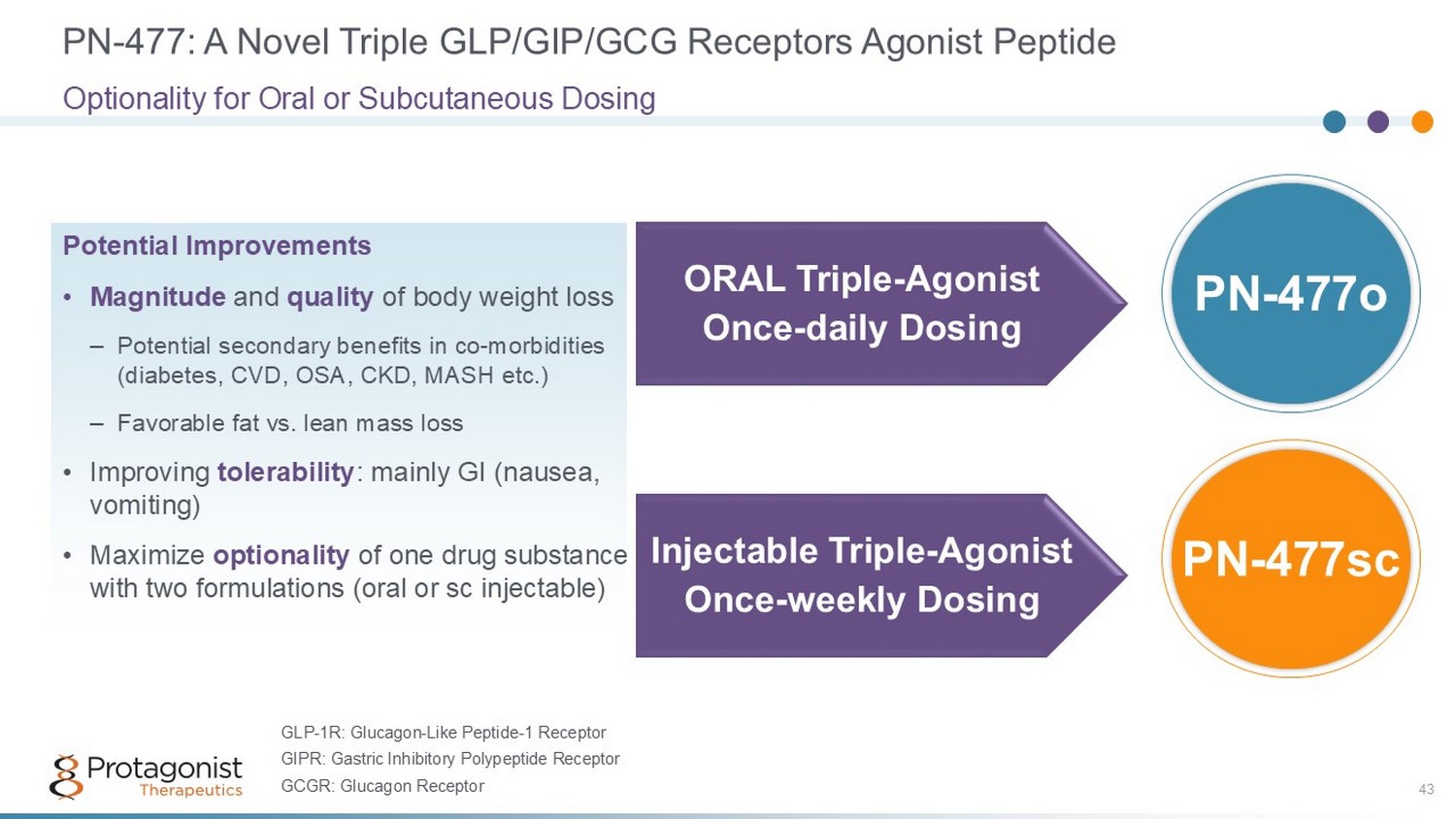 PN - 477 Oral Triple Agonist (GLP - 1R, GIPR, GCGR) Peptide 44 Criteria Attribute x nM potency vs GLP - 1R, GIPR, GCGR Potency x Stable in simulated gastric and intestinal fluids x Stable in serum x Metabolic stability x Thermostability Stability x Mouse Diet Induced Obesity (DIO) model Efficacy Model x Glucose control with glucose tolerance test in vivo Pharmacodynamics x Oral bioavailability demonstrated in mouse, rat, dog, cynomolgus monkey x GI stability and Oral PK supports once - a - day oral dosing x PK profile supports once - a - week subcutaneous dosing in vivo Pharmacokinetics Novel Chemical Entity, Oral Triple Agonist, Potent, and Stable in GI Fluids GI: Gastrointestinal; PK: Pharmacokinetic