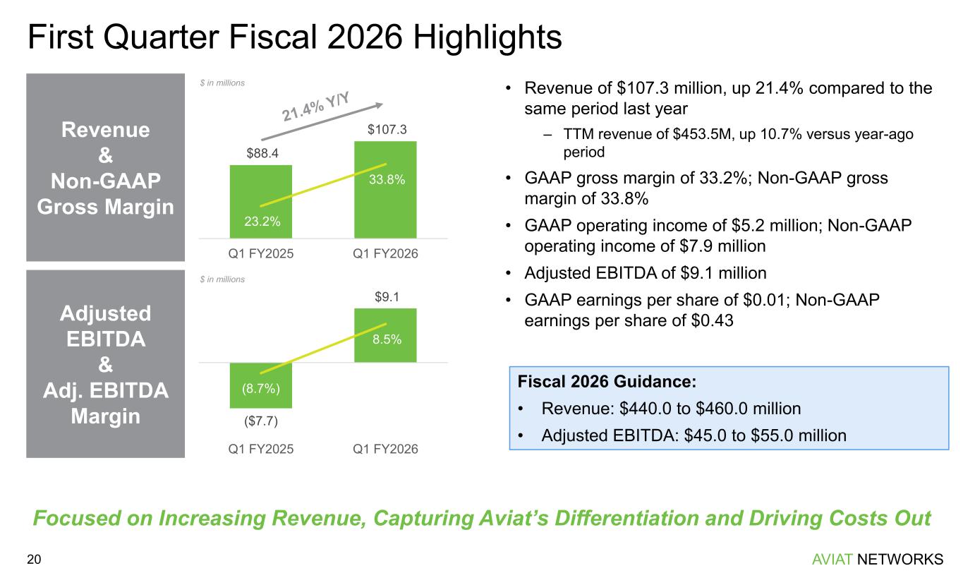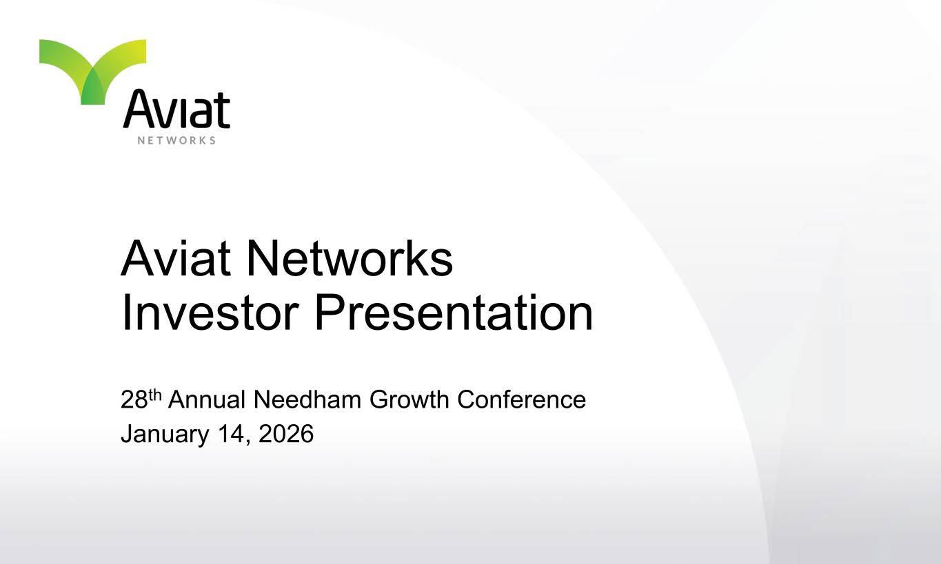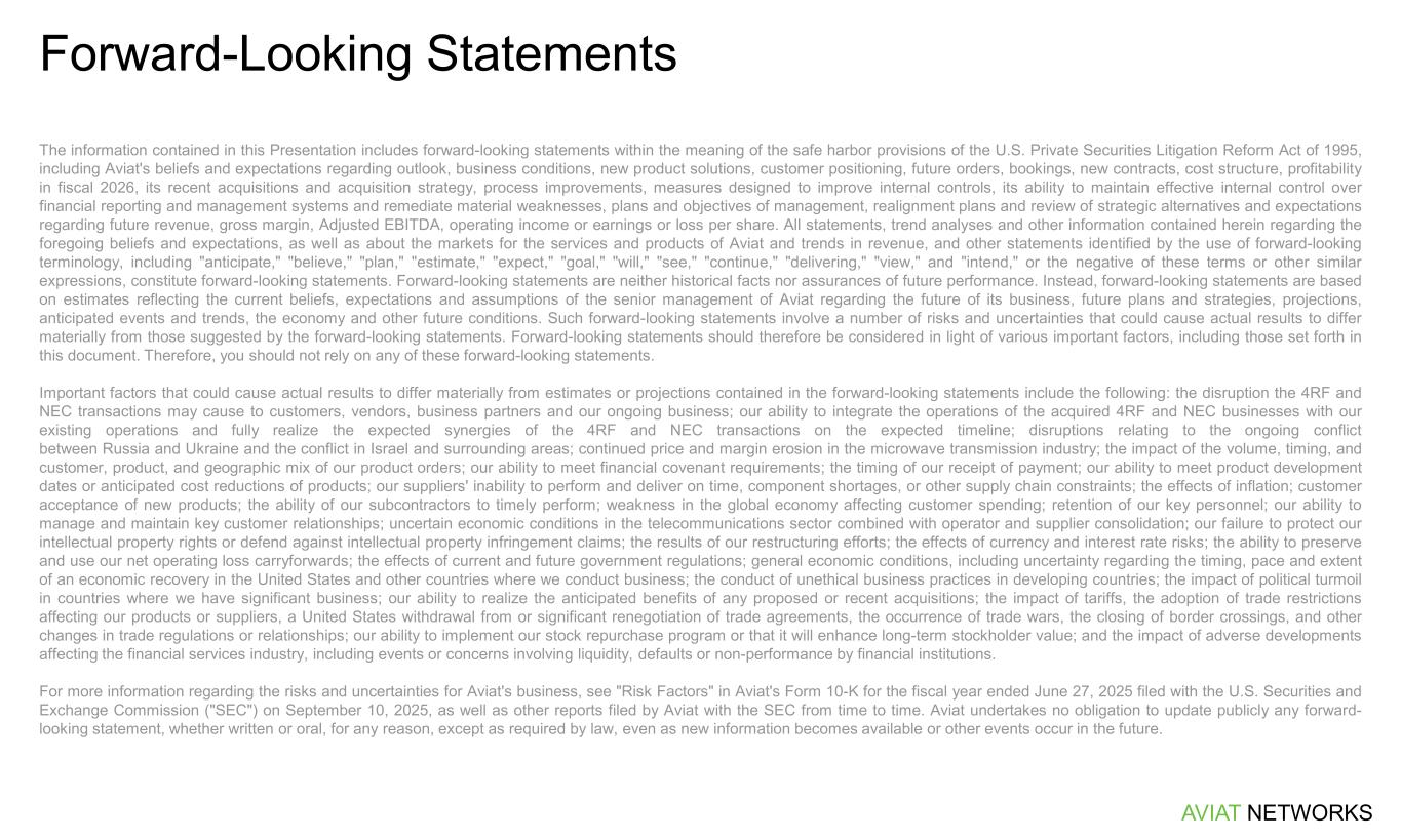 The information contained in this Presentation includes forward-looking statements within the meaning of the safe harbor provisions of the U.S. Private Securities Litigation Reform Act of 1995, including Aviat's beliefs and expectations regarding outlook, business conditions, new product solutions, customer positioning, future orders, bookings, new contracts, cost structure, profitability in fiscal 2026, its recent acquisitions and acquisition strategy, process improvements, measures designed to improve internal controls, its ability to maintain effective internal control over financial reporting and management systems and remediate material weaknesses, plans and objectives of management, realignment plans and review of strategic alternatives and expectations regarding future revenue, gross margin, Adjusted EBITDA, operating income or earnings or loss per share. All statements, trend analyses and other information contained herein regarding the foregoing beliefs and expectations, as well as about the markets for the services and products of Aviat and trends in revenue, and other statements identified by the use of forward-looking terminology, including "anticipate," "believe," "plan," "estimate," "expect," "goal," "will," "see," "continue," "delivering," "view," and "intend," or the negative of these terms or other similar expressions, constitute forward-looking statements. Forward-looking statements are neither historical facts nor assurances of future performance. Instead, forward-looking statements are based on estimates reflecting the current beliefs, expectations and assumptions of the senior management of Aviat regarding the future of its business, future plans and strategies, projections, anticipated events and trends, the economy and other future conditions. Such forward-looking statements involve a number of risks and uncertainties that could cause actual results to differ materially from those suggested by the forward-looking statements. Forward-looking statements should therefore be considered in light of various important factors, including those set forth in this document. Therefore, you should not rely on any of these forward-looking statements. Important factors that could cause actual results to differ materially from estimates or projections contained in the forward-looking statements include the following: the disruption the 4RF and NEC transactions may cause to customers, vendors, business partners and our ongoing business; our ability to integrate the operations of the acquired 4RF and NEC businesses with our existing operations and fully realize the expected synergies of the 4RF and NEC transactions on the expected timeline; disruptions relating to the ongoing conflict between Russia and Ukraine and the conflict in Israel and surrounding areas; continued price and margin erosion in the microwave transmission industry; the impact of the volume, timing, and customer, product, and geographic mix of our product orders; our ability to meet financial covenant requirements; the timing of our receipt of payment; our ability to meet product development dates or anticipated cost reductions of products; our suppliers' inability to perform and deliver on time, component shortages, or other supply chain constraints; the effects of inflation; customer acceptance of new products; the ability of our subcontractors to timely perform; weakness in the global economy affecting customer spending; retention of our key personnel; our ability to manage and maintain key customer relationships; uncertain economic conditions in the telecommunications sector combined with operator and supplier consolidation; our failure to protect our intellectual property rights or defend against intellectual property infringement claims; the results of our restructuring efforts; the effects of currency and interest rate risks; the ability to preserve and use our net operating loss carryforwards; the effects of current and future government regulations; general economic conditions, including uncertainty regarding the timing, pace and extent of an economic recovery in the United States and other countries where we conduct business; the conduct of unethical business practices in developing countries; the impact of political turmoil in countries where we have significant business; our ability to realize the anticipated benefits of any proposed or recent acquisitions; the impact of tariffs, the adoption of trade restrictions affecting our products or suppliers, a United States withdrawal from or significant renegotiation of trade agreements, the occurrence of trade wars, the closing of border crossings, and other changes in trade regulations or relationships; our ability to implement our stock repurchase program or that it will enhance long-term stockholder value; and the impact of adverse developments affecting the financial services industry, including events or concerns involving liquidity, defaults or non-performance by financial institutions. For more information regarding the risks and uncertainties for Aviat's business, see "Risk Factors" in Aviat's Form 10-K for the fiscal year ended June 27, 2025 filed with the U.S. Securities and Exchange Commission ("SEC") on September 10, 2025, as well as other reports filed by Aviat with the SEC from time to time. Aviat undertakes no obligation to update publicly any forward- looking statement, whether written or oral, for any reason, except as required by law, even as new information becomes available or other events occur in the future. Forward-Looking Statements AVIAT NETWORKS