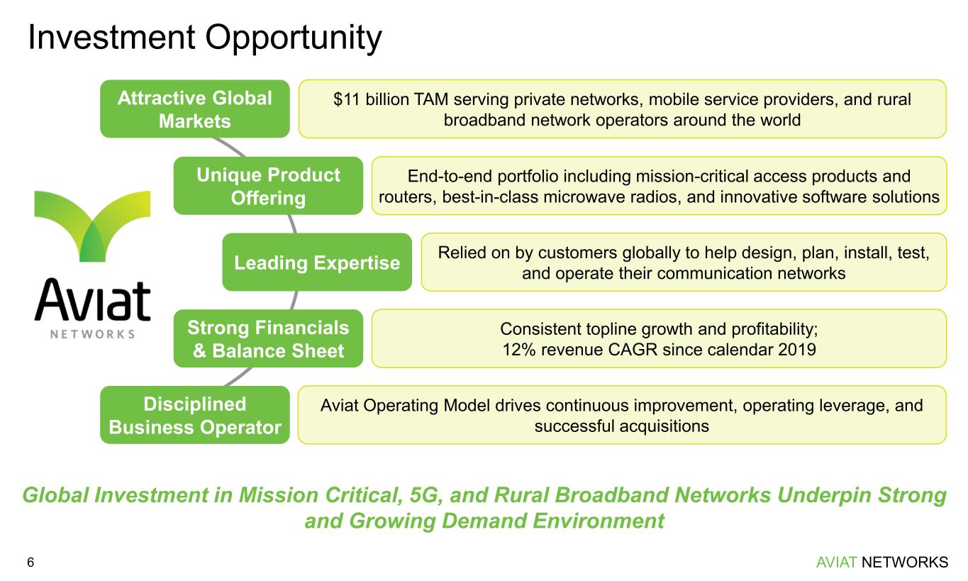 AVIAT NETWORKS5 A Long History of Wireless Leadership Invigorated by New Leadership and Consistent Execution Over 75 Years of Expertise 1944 Aviat Networks can trace its wireless beginnings back to Lenkurt Electric 2007 Harris Stratex Networks forms as the result of the merger between Harris MCD and Stratex Networks 2010 Harris Stratex rebrands as Aviat Networks 2020 New management leadership brings the company renewed customer focus and disciplined operating model 2022 Aviat Networks completes the acquisition of Redline Communications, adding access solutions to its portfolio 2023 Aviat Networks completes the acquisition of the NEC microwave business (Pasolink) Microwave Division 2024 Aviat Networks completes the acquisition of 4RF, adding industrial SCADA and cellular router offerings to its access portfolio