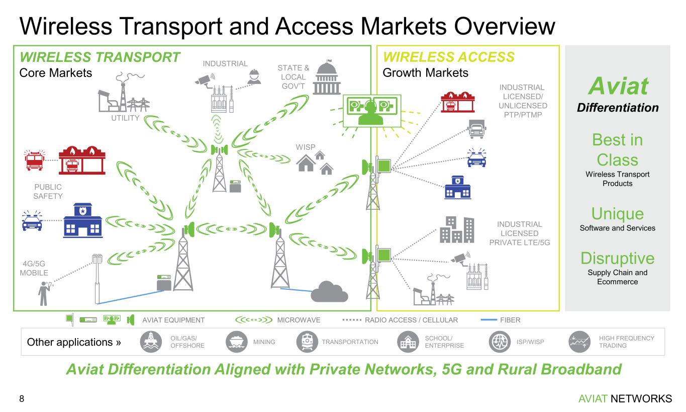 AVIAT NETWORKS Aviat’s Competitive Advantage vs. Microwave Specialists vs. Wireless Generalists Products ✓ Modular radio platform ✓ End-to-end offering of radios, multi- band, routers, access ✓ Better RF performance • Highly leveraged in chipsets • Difficult to create new product variants quickly • Unable to invest in routing and other products • Microwave not focus • Less responsive and agile to bringing radio solutions to market Software & Services ✓ Turnkey services portfolio (design, planning, install) ✓ Software innovations to ease network operations and total cost of ownership (AviatCloud, Assurance software) • Product focus and lack of software investment • Lack of experience and services make competing in private networks difficult • Lack focus on dedicated software solutions for transport networks Supply Chain ✓ Core competence – fast deliveries and disruptive go-to-market like the Aviat Store • Lack modularity limits supply chain flexibility • Unable to create new business models or react to Aviat innovations • Microwave supply chain not a priority vs. RAN • Cannot react to Aviat innovations 7 Aviat Provides More Innovation and Better Value Than Our Competitors Why Aviat Wins