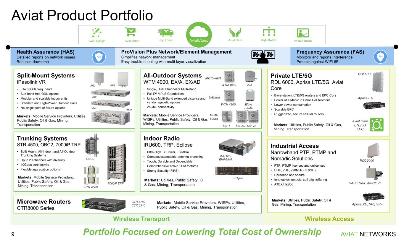 AVIAT NETWORKS Wireless Transport and Access Markets Overview 8 Aviat Differentiation Aligned with Private Networks, 5G and Rural Broadband WIRELESS ACCESS Growth Markets STATE & LOCAL GOV’T UTILITY PUBLIC SAFETY 4G/5G MOBILE WIRELESS TRANSPORT Core Markets INDUSTRIAL LICENSED/ UNLICENSED PTP/PTMP INDUSTRIAL LICENSED PRIVATE LTE/5G FIBERRADIO ACCESS / CELLULAR Other applications » INDUSTRIAL MICROWAVE Aviat Differentiation Best in Class Wireless Transport Products Unique Software and Services Disruptive Supply Chain and Ecommerce HIGH FREQUENCY TRADING SCHOOL/ ENTERPRISE OIL/GAS/ OFFSHORE TRANSPORTATION ISP/WISPMINING AVIAT EQUIPMENT WISP