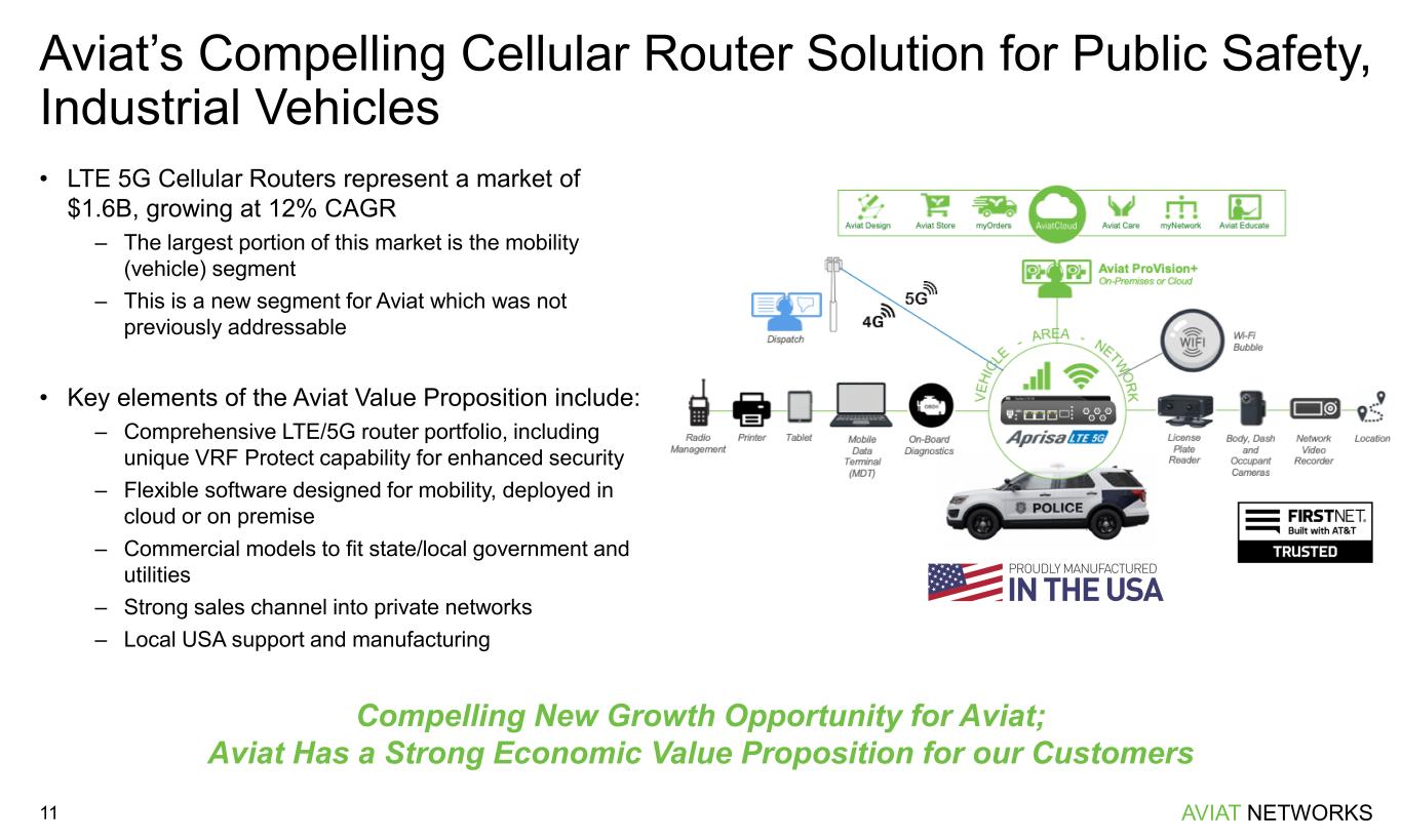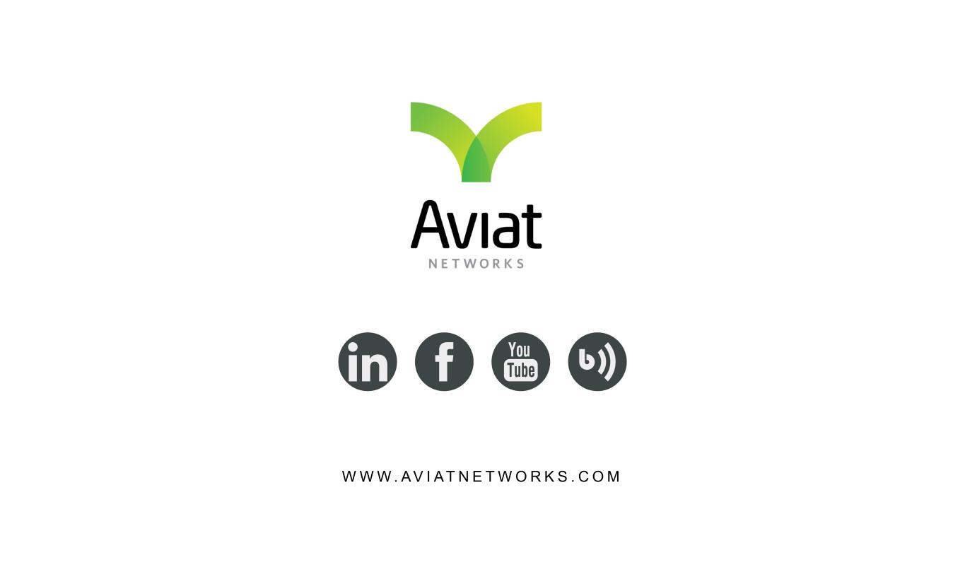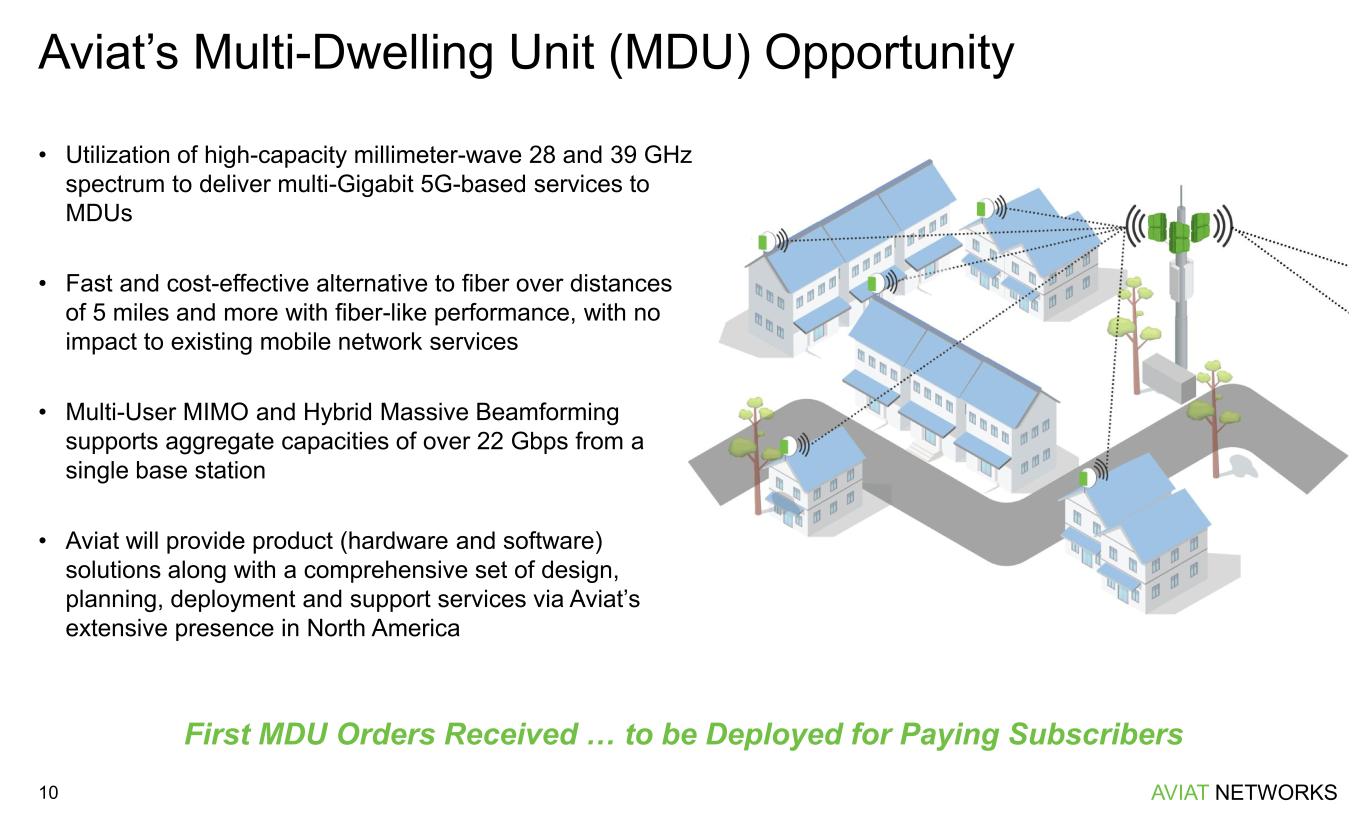 AVIAT NETWORKS Aviat’s Multi-Dwelling Unit (MDU) Opportunity 10 First MDU Orders Received … to be Deployed for Paying Subscribers • Utilization of high-capacity millimeter-wave 28 and 39 GHz spectrum to deliver multi-Gigabit 5G-based services to MDUs • Fast and cost-effective alternative to fiber over distances of 5 miles and more with fiber-like performance, with no impact to existing mobile network services • Multi-User MIMO and Hybrid Massive Beamforming supports aggregate capacities of over 22 Gbps from a single base station • Aviat will provide product (hardware and software) solutions along with a comprehensive set of design, planning, deployment and support services via Aviat’s extensive presence in North America