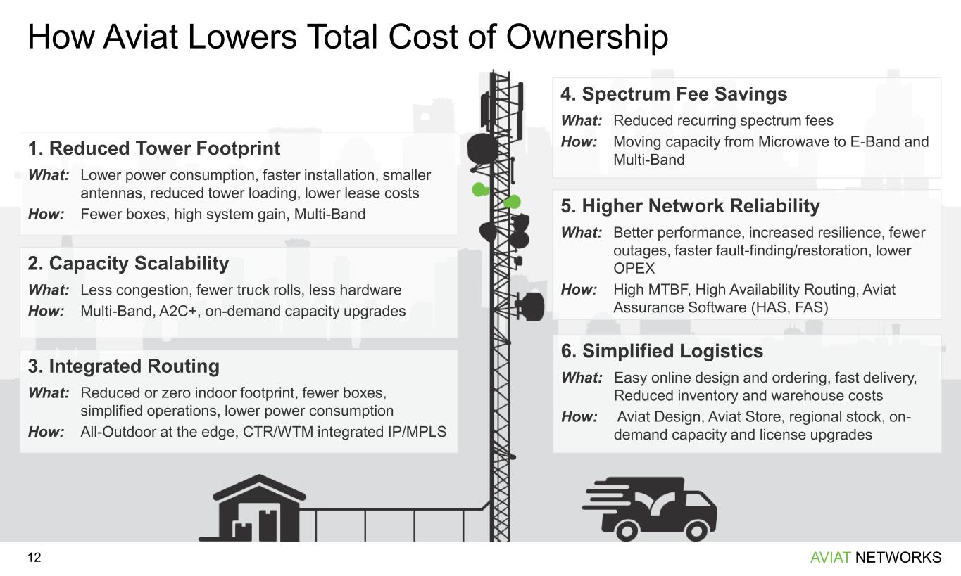 AVIAT NETWORKS Aviat’s Compelling Cellular Router Solution for Public Safety, Industrial Vehicles 11 Compelling New Growth Opportunity for Aviat; Aviat Has a Strong Economic Value Proposition for our Customers • LTE 5G Cellular Routers represent a market of $1.6B, growing at 12% CAGR – The largest portion of this market is the mobility (vehicle) segment – This is a new segment for Aviat which was not previously addressable • Key elements of the Aviat Value Proposition include: – Comprehensive LTE/5G router portfolio, including unique VRF Protect capability for enhanced security – Flexible software designed for mobility, deployed in cloud or on premise – Commercial models to fit state/local government and utilities – Strong sales channel into private networks – Local USA support and manufacturing