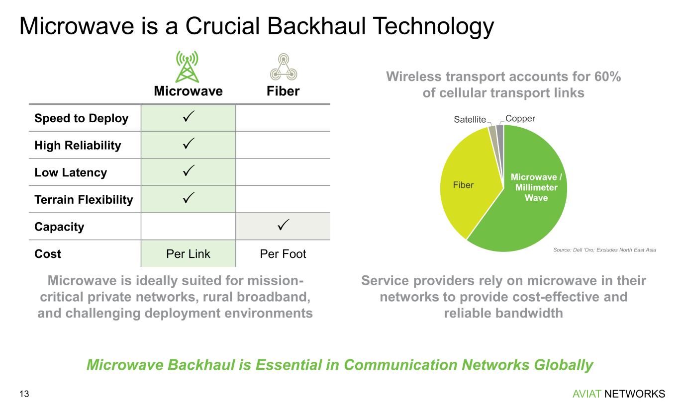 AVIAT NETWORKS How Aviat Lowers Total Cost of Ownership 12 1. Reduced Tower Footprint What: Lower power consumption, faster installation, smaller antennas, reduced tower loading, lower lease costs How: Fewer boxes, high system gain, Multi-Band 2. Capacity Scalability What: Less congestion, fewer truck rolls, less hardware How: Multi-Band, A2C+, on-demand capacity upgrades 3. Integrated Routing What: Reduced or zero indoor footprint, fewer boxes, simplified operations, lower power consumption How: All-Outdoor at the edge, CTR/WTM integrated IP/MPLS 4. Spectrum Fee Savings What: Reduced recurring spectrum fees How: Moving capacity from Microwave to E-Band and Multi-Band 5. Higher Network Reliability What: Better performance, increased resilience, fewer outages, faster fault-finding/restoration, lower OPEX How: High MTBF, High Availability Routing, Aviat Assurance Software (HAS, FAS) 6. Simplified Logistics What: Easy online design and ordering, fast delivery, Reduced inventory and warehouse costs How: Aviat Design, Aviat Store, regional stock, on- demand capacity and license upgrades