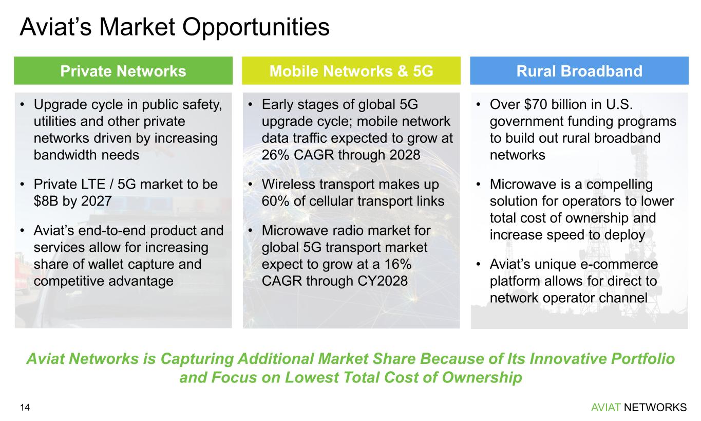 AVIAT NETWORKS Microwave is a Crucial Backhaul Technology 13 Microwave Fiber Speed to Deploy High Reliability Low Latency Terrain Flexibility Capacity Cost Per Link Per Foot Microwave / Millimeter Wave Fiber Satellite Copper Microwave Backhaul is Essential in Communication Networks Globally Wireless transport accounts for 60% of cellular transport links Source: Dell ‘Oro; Excludes North East Asia Microwave is ideally suited for mission- critical private networks, rural broadband, and challenging deployment environments Service providers rely on microwave in their networks to provide cost-effective and reliable bandwidth