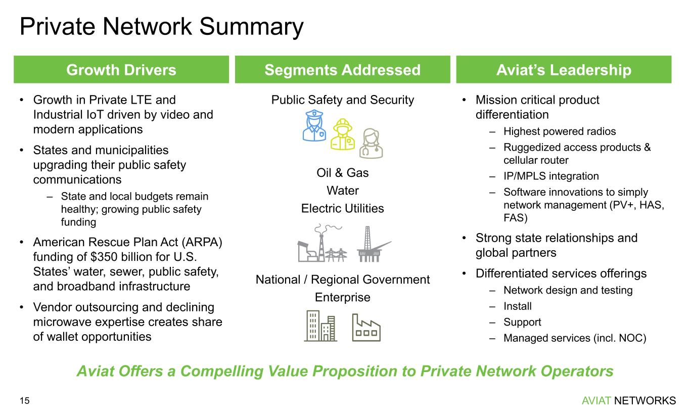 AVIAT NETWORKS • Upgrade cycle in public safety, utilities and other private networks driven by increasing bandwidth needs • Private LTE / 5G market to be $8B by 2027 • Aviat’s end-to-end product and services allow for increasing share of wallet capture and competitive advantage • Early stages of global 5G upgrade cycle; mobile network data traffic expected to grow at 26% CAGR through 2028 • Wireless transport makes up 60% of cellular transport links • Microwave radio market for global 5G transport market expect to grow at a 16% CAGR through CY2028 • Over $70 billion in U.S. government funding programs to build out rural broadband networks • Microwave is a compelling solution for operators to lower total cost of ownership and increase speed to deploy • Aviat’s unique e-commerce platform allows for direct to network operator channel Aviat’s Market Opportunities 14 Aviat Networks is Capturing Additional Market Share Because of Its Innovative Portfolio and Focus on Lowest Total Cost of Ownership Private Networks Mobile Networks & 5G Rural Broadband