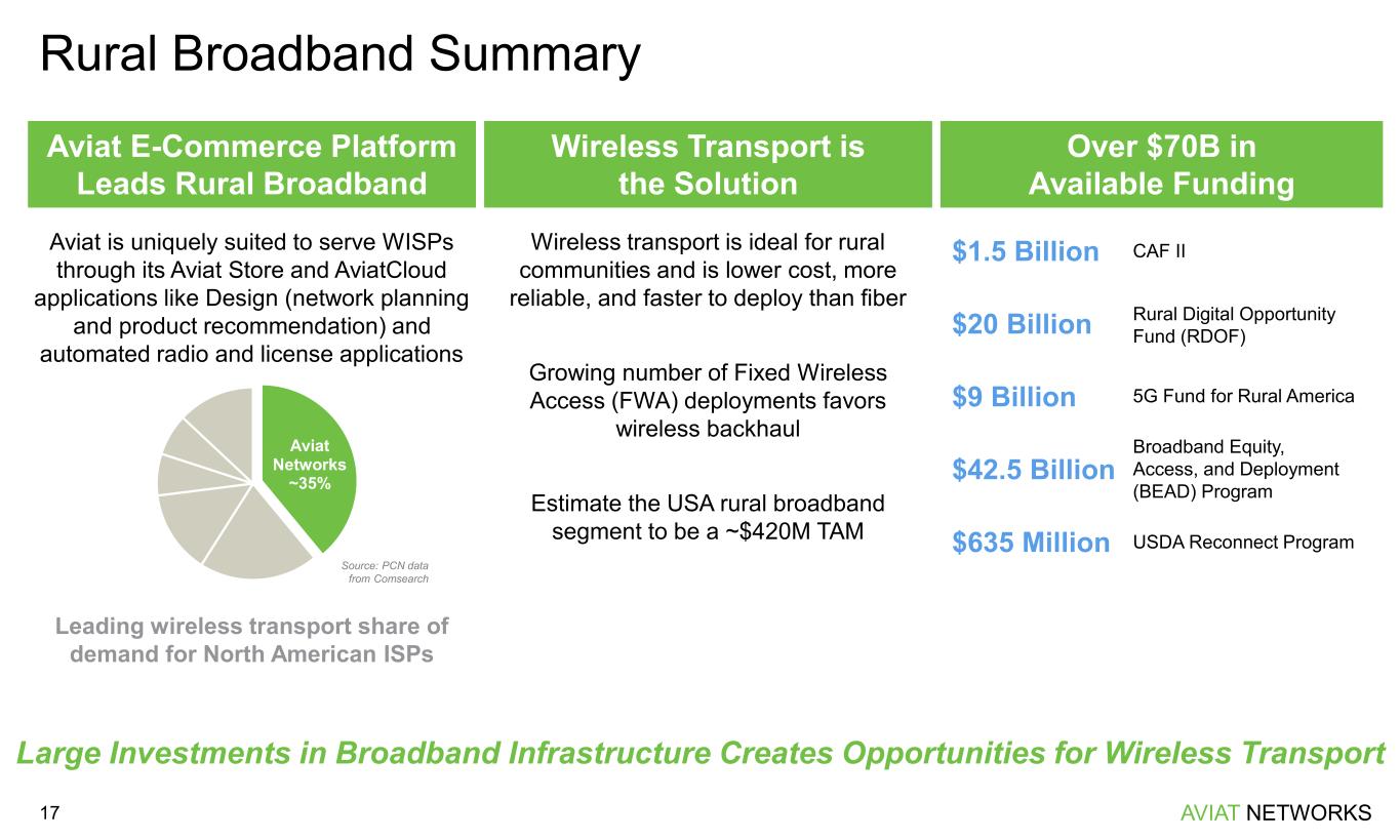 AVIAT NETWORKS Mobile Networks & 5G Market Summary 16 • Mobile service provider market driven by increasing bandwidth demand in 4G and 5G networks – Data from global networks is anticipated to grow rapidly (26% CAGR) through 2028, driven by 5G adoption and expanding 4G networks • Aviat’s product portfolio enables operators to increase their network capacity while lowering total cost of ownership (TCO) – Single-box multi-band lowers tower leasing costs while increase capacity – Vendor-agnostic multi-band allows operators to utilize existing radios and layer on Aviat’s solution, lowering the barrier to entry for Aviat into a network – Multi-band XD enables longer distances between links which helps to minimize total network capex – Highest capacity radio available on the market (20 Gbps) • Aviat’s multi-band is up to $10,000/link lower TCO vs competitive multi-band offerings – Superior solution → Less hardware → Lowest TCO CY24 CY25 CY26 CY27 CY28 Demand for Wireless Transport Driven by Increasing Data Consumption Global 5G Wireless Transport Market Source: Dell ‘Oro 0 100 200 300 400 500 2022 2023 2024 2025 2026 2027 2028 E B p e r m o n th FWA 5G 2G/3G/4G $2.1B Market Global Mobile Network Data Traffic Source: Ericsson Mobility Report