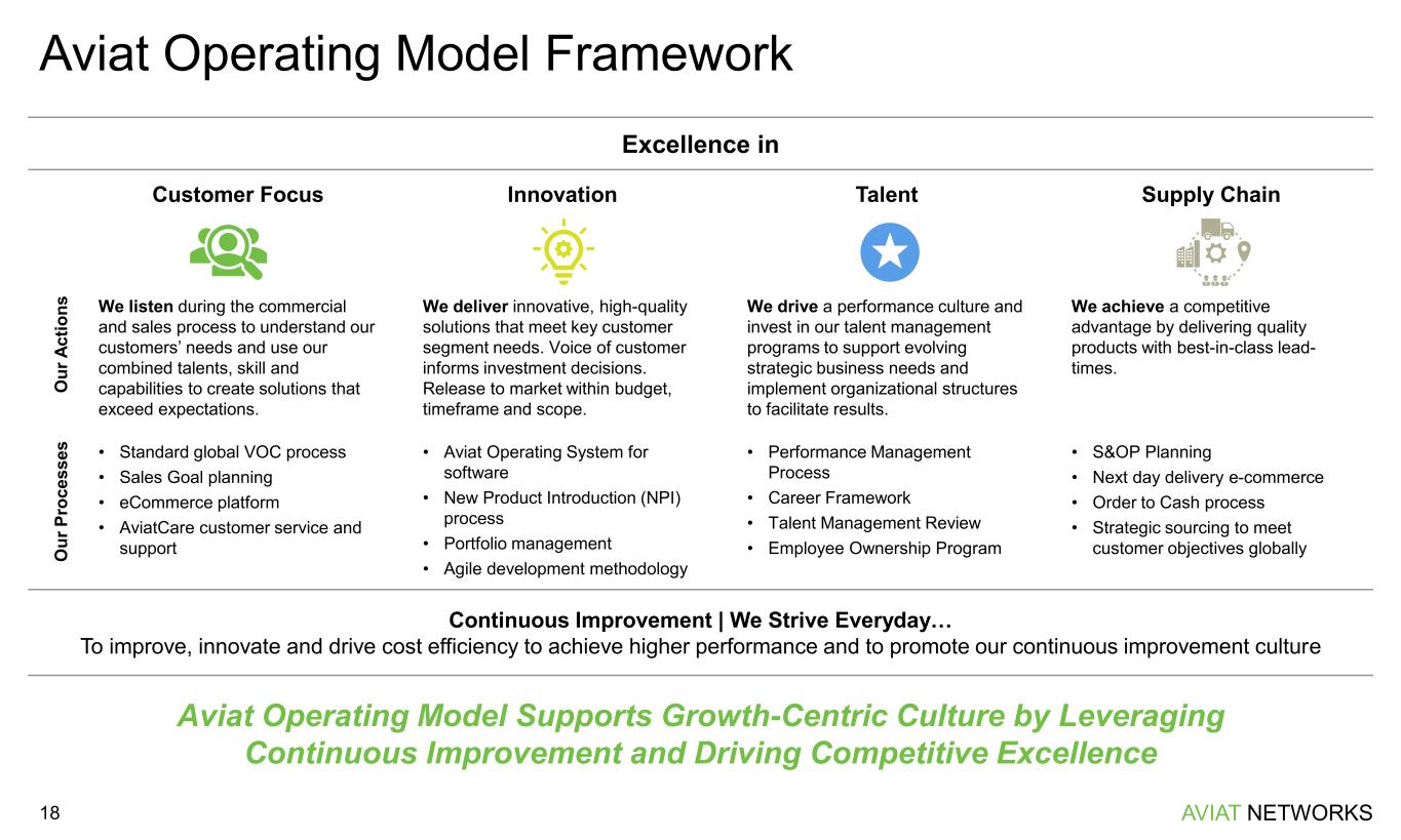 AVIAT NETWORKS18 Aviat Operating Model Supports Growth-Centric Culture by Leveraging Continuous Improvement and Driving Competitive Excellence Aviat Operating Model Framework Excellence in Customer Focus Innovation Talent Supply Chain O u r A c ti o n s We listen during the commercial and sales process to understand our customers’ needs and use our combined talents, skill and capabilities to create solutions that exceed expectations. We deliver innovative, high-quality solutions that meet key customer segment needs. Voice of customer informs investment decisions. Release to market within budget, timeframe and scope. We drive a performance culture and invest in our talent management programs to support evolving strategic business needs and implement organizational structures to facilitate results. We achieve a competitive advantage by delivering quality products with best-in-class lead- times. O u r P ro c e s s e s • Standard global VOC process • Sales Goal planning • eCommerce platform • AviatCare customer service and support • Aviat Operating System for software • New Product Introduction (NPI) process • Portfolio management • Agile development methodology • Performance Management Process • Career Framework • Talent Management Review • Employee Ownership Program • S&OP Planning • Next day delivery e-commerce • Order to Cash process • Strategic sourcing to meet customer objectives globally Continuous Improvement | We Strive Everyday… To improve, innovate and drive cost efficiency to achieve higher performance and to promote our continuous improvement culture