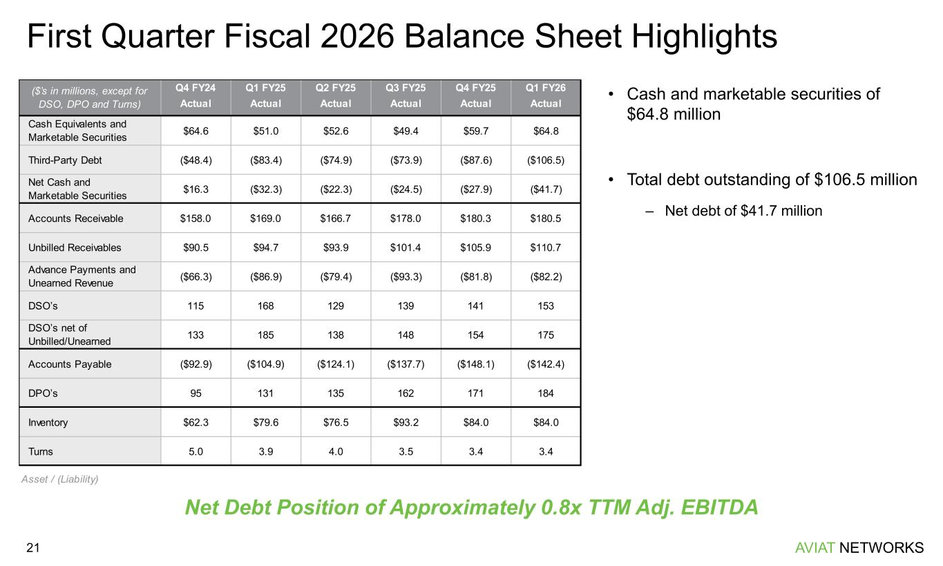 AVIAT NETWORKS ($7.7) $9.1 (8.7%) 8.5% (30.0%) (25.0%) (20.0%) (15.0%) (10.0%) (5.0%) – 5.0% 10.0% 15.0% 20.0% ($12.0) ($7.0) ($2.0) $3.0 $8.0 Q1 FY2025 Q1 FY2026 $88.4 $107.3 23.2% 33.8% 15.0% 20.0% 25.0% 30.0% 35.0% 40.0% 45.0% 50.0% $30.0 $50.0 $70.0 $90.0 $110.0 $130.0 Q1 FY2025 Q1 FY2026 First Quarter Fiscal 2026 Highlights 20 • Revenue of $107.3 million, up 21.4% compared to the same period last year – TTM revenue of $453.5M, up 10.7% versus year-ago period • GAAP gross margin of 33.2%; Non-GAAP gross margin of 33.8% • GAAP operating income of $5.2 million; Non-GAAP operating income of $7.9 million • Adjusted EBITDA of $9.1 million • GAAP earnings per share of $0.01; Non-GAAP earnings per share of $0.43 Focused on Increasing Revenue, Capturing Aviat’s Differentiation and Driving Costs Out Revenue & Non-GAAP Gross Margin Adjusted EBITDA & Adj. EBITDA Margin $ in millions $ in millions Fiscal 2026 Guidance: • Revenue: $440.0 to $460.0 million • Adjusted EBITDA: $45.0 to $55.0 million