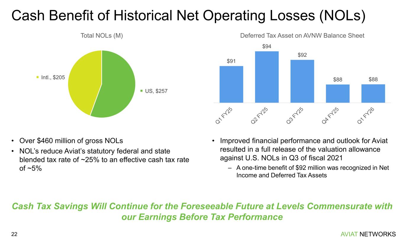 AVIAT NETWORKS First Quarter Fiscal 2026 Balance Sheet Highlights 21 • Cash and marketable securities of $64.8 million • Total debt outstanding of $106.5 million – Net debt of $41.7 million Net Debt Position of Approximately 0.8x TTM Adj. EBITDA Q4 FY24 Q1 FY25 Q2 FY25 Q3 FY25 Q4 FY25 Q1 FY26 Actual Actual Actual Actual Actual Actual Cash Equivalents and Marketable Securities $64.6 $51.0 $52.6 $49.4 $59.7 $64.8 Third-Party Debt ($48.4) ($83.4) ($74.9) ($73.9) ($87.6) ($106.5) Net Cash and Marketable Securities $16.3 ($32.3) ($22.3) ($24.5) ($27.9) ($41.7) Accounts Receivable $158.0 $169.0 $166.7 $178.0 $180.3 $180.5 Unbilled Receivables $90.5 $94.7 $93.9 $101.4 $105.9 $110.7 Advance Payments and Unearned Revenue ($66.3) ($86.9) ($79.4) ($93.3) ($81.8) ($82.2) DSO’s 115 168 129 139 141 153 DSO’s net of Unbilled/Unearned 133 185 138 148 154 175 Accounts Payable ($92.9) ($104.9) ($124.1) ($137.7) ($148.1) ($142.4) DPO’s 95 131 135 162 171 184 Inventory $62.3 $79.6 $76.5 $93.2 $84.0 $84.0 Turns 5.0 3.9 4.0 3.5 3.4 3.4 Asset / (Liability) ($’s in millions, except for DSO, DPO and Turns)