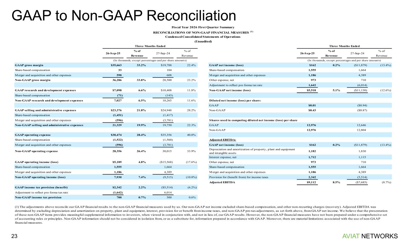 AVIAT NETWORKS23 GAAP to Non-GAAP Reconciliation Fiscal Year 2026 First Quarter Summary RECONCILIATIONS OF NON-GAAP FINANCIAL MEASURES (1) Condensed Consolidated Statements of Operations (Unaudited) % of % of % of % of Revenue Revenue Revenue Revenue GAAP gross margin $35,663 33.2% $19,788 22.4% GAAP net income (loss) $162 0.2% ($11,879) (13.4%) Share-based compensation 33 104 Share-based compensation 1,555 1,664 Merger and acquisition and other expenses 590 608 Merger and acquisition and other expenses 1,186 4,389 Non-GAAP gross margin 36,286 33.8% 20,500 23.2% Other expense, net 973 710 Adjustment to reflect pro forma tax rate 1,642 (6,014) GAAP research and development expenses $7,098 6.6% $10,408 11.8% Non-GAAP net income (loss) $5,518 5.1% ($11,130) (12.6%) Share-based compensation (71) (143) Non-GAAP research and development expenses 7,027 6.5% 10,265 11.6% Diluted net income (loss) per share: GAAP $0.01 ($0.94) GAAP selling and administrative expenses $23,376 21.8% $24,948 28.2% Non-GAAP $0.43 ($0.87) Share-based compensation (1,451) (1,417) Merger and acquisition and other expenses (596) (3,781) Shares used in computing diluted net income (loss) per share Non-GAAP selling and administrative expenses 21,329 19.9% 19,750 22.3% GAAP 12,976 12,646 Non-GAAP 12,976 12,804 GAAP operating expense $30,474 28.4% $35,356 40.0% Share-based compensation (1,522) (1,560) Adjusted EBITDA: Merger and acquisition and other expenses (596) (3,781) GAAP net income (loss) $162 0.2% ($11,879) (13.4%) Non-GAAP operating expense 28,356 26.4% 30,015 33.9% Depreciation and amortization of property, plant and equipment and intangible assets 1,182 1,830 Interest expense, net 1,712 1,115 GAAP operating income (loss) $5,189 4.8% ($15,568) (17.6%) Other expense, net 973 710 Share-based compensation 1,555 1,664 Share-based compensation 1,555 1,664 Merger and acquisition and other expenses 1,186 4,389 Merger and acquisition and other expenses 1,186 4,389 Non-GAAP operating income (loss) 7,930 7.4% (9,515) (10.8%) Provision for (benefit from) for income taxes 2,342 (5,514) Adjusted EBITDA $9,112 8.5% ($7,685) (8.7%) GAAP income tax provision (benefit) $2,342 2.2% ($5,514) (6.2%) Adjustment to reflect pro forma tax rate (1,642) 6,014 Non-GAAP income tax provision 700 0.7% 500 0.6% (1) The adjustments above reconcile our GAAP financial results to the non-GAAP financial measures used by us. Our non-GAAP net income excluded share-based compensation, and other non-recurring charges (recovery). Adjusted EBITDA was determined by excluding depreciation and amortization on property, plant and equipment, interest, provision for or benefit from income taxes, and non-GAAP pre-tax adjustments, as set forth above, from GAAP net income. We believe that the presentation of these non-GAAP items provides meaningful supplemental information to investors, when viewed in conjunction with, and not in lieu of, our GAAP results. However, the non-GAAP financial measures have not been prepared under a comprehensive set of accounting rules or principles. Non-GAAP information should not be considered in isolation from, or as a substitute for, information prepared in accordance with GAAP. Moreover, there are material limitations associated with the use of non-GAAP financial measures. (In thousands, except percentages and per share amounts) Three Months Ended 26-Sep-25 27-Sep-24 (In thousands, except percentages and per share amounts) Three Months Ended 26-Sep-25 27-Sep-24