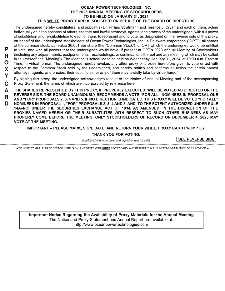 NOTICE IS HEREBY GIVEN that the 2023 Annual Meeting of Stockholders of Ocean Power Technologies, Inc. (the “Company,” “OPT,” “we,” “us” or “our”) will be held on Wednesday, January 31, 2024, at 10:00 a.m., Eastern Time, in virtual meeting format only, via live webcast (including any adjournments, postponements, or continuations thereof, the “2023 Annual Meeting”). The 2023 Annual Meeting will be conducted in a virtual format to provide stockholders the opportunity to attend, irrespective of location.