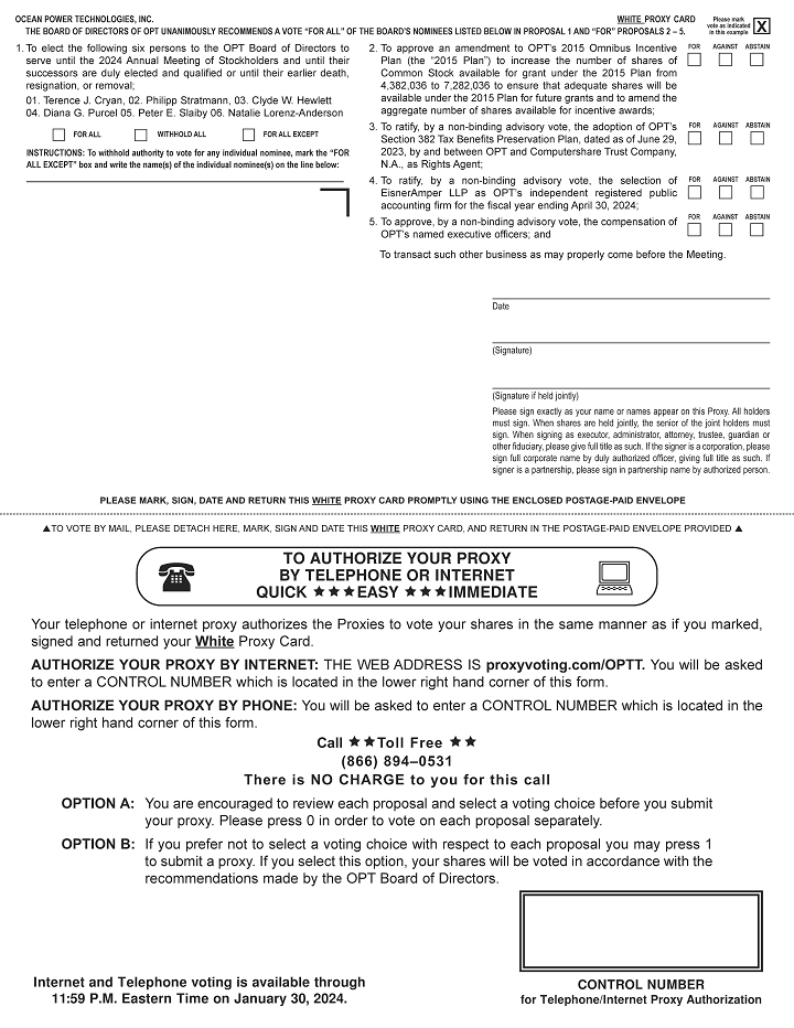 This proxy statement (including all appendices attached hereto, this “Proxy Statement”) and the enclosed WHITE proxy card are being furnished to stockholders in connection with the solicitation of proxies by the Board of Directors (the “Board” or the “Board of Directors”) of Ocean Power Technologies, Inc., a Delaware corporation (“OPT,” the “Company,” “we,” “us” or “our”), for use at OPT’s 2023 Annual Meeting of Stockholders (including any adjournments, postponements, or continuations thereof, the “2023 Annual Meeting”). We anticipate that this proxy statement and the enclosed form of WHITE proxy card will first be sent or made available to stockholders of record as of the close of business on December 4, 2023 on or about December 6, 2023.