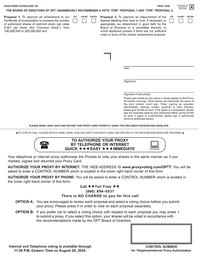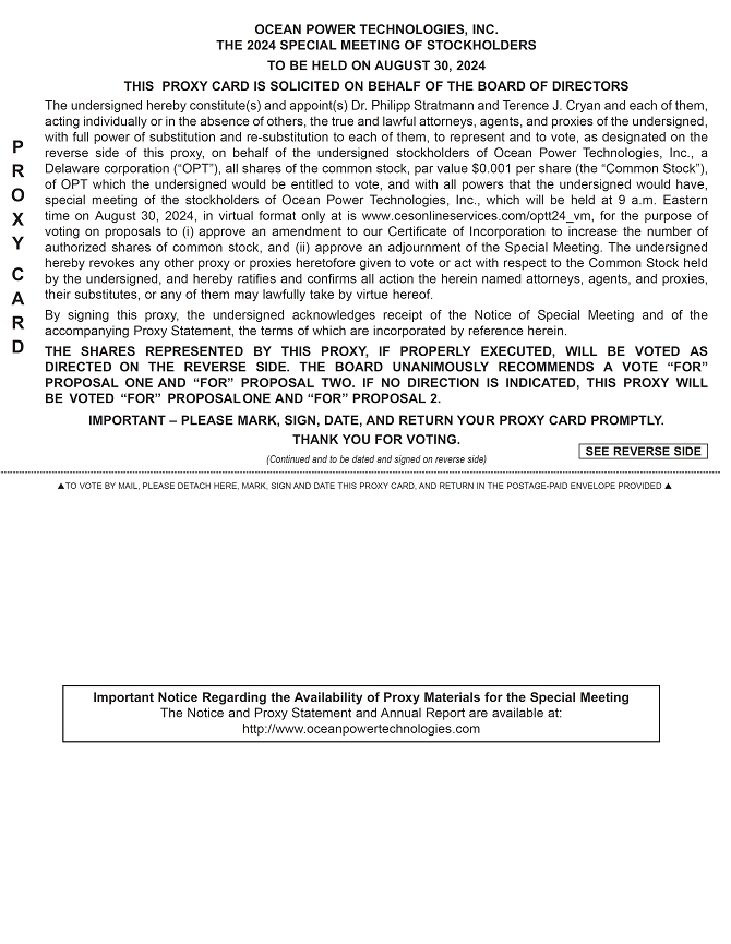 You are cordially invited to attend a special meeting of the stockholders of Ocean Power Technologies, Inc., which will be held at 9 a.m. Eastern time on August 30, 2024, in virtual format only at www.cesonlineservices.com/optt24_vm, for the purpose of voting on proposals to (i) approve an amendment to our Certificate of Incorporation to increase the number of authorized shares of common stock, par value $.001 per share, from 100,000,000 to 200,000,000, and (ii) approve an adjournment of the Special Meeting from time to time, if necessary or appropriate (as determined in good faith by the Board or a committee thereof), to solicit additional proxies if there are not sufficient votes in favor of the charter amendment proposal.