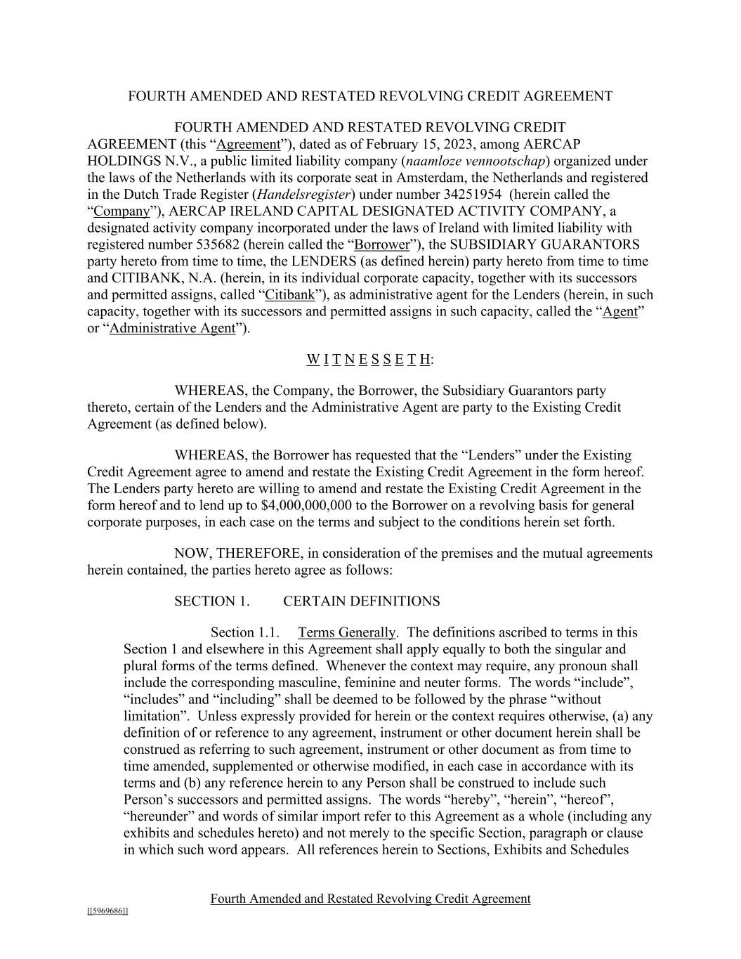 Fourth Amended and Restated Revolving Credit Agreement [[5969686]] FOURTH AMENDED AND RESTATED REVOLVING CREDIT AGREEMENT FOURTH AMENDED AND RESTATED REVOLVING CREDIT AGREEMENT (this “Agreement”), dated as of February 15, 2023, among AERCAP HOLDINGS N.V., a public limited liability company (naamloze vennootschap) organized under the laws of the Netherlands with its corporate seat in Amsterdam, the Netherlands and registered in the Dutch Trade Register (Handelsregister) under number 34251954 (herein called the “Company”), AERCAP IRELAND CAPITAL DESIGNATED ACTIVITY COMPANY, a designated activity company incorporated under the laws of Ireland with limited liability with registered number 535682 (herein called the “Borrower”), the SUBSIDIARY GUARANTORS party hereto from time to time, the LENDERS (as defined herein) party hereto from time to time and CITIBANK, N.A. (herein, in its individual corporate capacity, together with its successors and permitted assigns, called “Citibank”), as administrative agent for the Lenders (herein, in such capacity, together with its successors and permitted assigns in such capacity, called the “Agent” or “Administrative Agent”). W I T N E S S E T H: WHEREAS, the Company, the Borrower, the Subsidiary Guarantors party thereto, certain of the Lenders and the Administrative Agent are party to the Existing Credit Agreement (as defined below). WHEREAS, the Borrower has requested that the “Lenders” under the Existing Credit Agreement agree to amend and restate the Existing Credit Agreement in the form hereof. The Lenders party hereto are willing to amend and restate the Existing Credit Agreement in the form hereof and to lend up to $4,000,000,000 to the Borrower on a revolving basis for general corporate purposes, in each case on the terms and subject to the conditions herein set forth. NOW, THEREFORE, in consideration of the premises and the mutual agreements herein contained, the parties hereto agree as follows: SECTION 1. CERTAIN DEFINITIONS Section 1.1. Terms Generally. The definitions ascribed to terms in this Section 1 and elsewhere in this Agreement shall apply equally to both the singular and plural forms of the terms defined. Whenever the context may require, any pronoun shall include the corresponding masculine, feminine and neuter forms. The words “include”, “includes” and “including” shall be deemed to be followed by the phrase “without limitation”. Unless expressly provided for herein or the context requires otherwise, (a) any definition of or reference to any agreement, instrument or other document herein shall be construed as referring to such agreement, instrument or other document as from time to time amended, supplemented or otherwise modified, in each case in accordance with its terms and (b) any reference herein to any Person shall be construed to include such Person’s successors and permitted assigns. The words “hereby”, “herein”, “hereof”, “hereunder” and words of similar import refer to this Agreement as a whole (including any exhibits and schedules hereto) and not merely to the specific Section, paragraph or clause in which such word appears. All references herein to Sections, Exhibits and Schedules