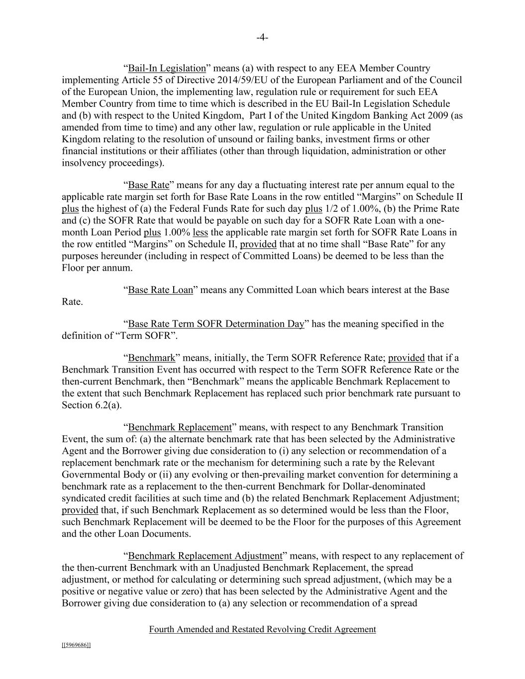 -4- Fourth Amended and Restated Revolving Credit Agreement [[5969686]] “Bail-In Legislation” means (a) with respect to any EEA Member Country implementing Article 55 of Directive 2014/59/EU of the European Parliament and of the Council of the European Union, the implementing law, regulation rule or requirement for such EEA Member Country from time to time which is described in the EU Bail-In Legislation Schedule and (b) with respect to the United Kingdom, Part I of the United Kingdom Banking Act 2009 (as amended from time to time) and any other law, regulation or rule applicable in the United Kingdom relating to the resolution of unsound or failing banks, investment firms or other financial institutions or their affiliates (other than through liquidation, administration or other insolvency proceedings). “Base Rate” means for any day a fluctuating interest rate per annum equal to the applicable rate margin set forth for Base Rate Loans in the row entitled “Margins” on Schedule II plus the highest of (a) the Federal Funds Rate for such day plus 1/2 of 1.00%, (b) the Prime Rate and (c) the SOFR Rate that would be payable on such day for a SOFR Rate Loan with a one- month Loan Period plus 1.00% less the applicable rate margin set forth for SOFR Rate Loans in the row entitled “Margins” on Schedule II, provided that at no time shall “Base Rate” for any purposes hereunder (including in respect of Committed Loans) be deemed to be less than the Floor per annum. “Base Rate Loan” means any Committed Loan which bears interest at the Base Rate. “Base Rate Term SOFR Determination Day” has the meaning specified in the definition of “Term SOFR”. “Benchmark” means, initially, the Term SOFR Reference Rate; provided that if a Benchmark Transition Event has occurred with respect to the Term SOFR Reference Rate or the then-current Benchmark, then “Benchmark” means the applicable Benchmark Replacement to the extent that such Benchmark Replacement has replaced such prior benchmark rate pursuant to Section 6.2(a). “Benchmark Replacement” means, with respect to any Benchmark Transition Event, the sum of: (a) the alternate benchmark rate that has been selected by the Administrative Agent and the Borrower giving due consideration to (i) any selection or recommendation of a replacement benchmark rate or the mechanism for determining such a rate by the Relevant Governmental Body or (ii) any evolving or then-prevailing market convention for determining a benchmark rate as a replacement to the then-current Benchmark for Dollar-denominated syndicated credit facilities at such time and (b) the related Benchmark Replacement Adjustment; provided that, if such Benchmark Replacement as so determined would be less than the Floor, such Benchmark Replacement will be deemed to be the Floor for the purposes of this Agreement and the other Loan Documents. “Benchmark Replacement Adjustment” means, with respect to any replacement of the then-current Benchmark with an Unadjusted Benchmark Replacement, the spread adjustment, or method for calculating or determining such spread adjustment, (which may be a positive or negative value or zero) that has been selected by the Administrative Agent and the Borrower giving due consideration to (a) any selection or recommendation of a spread