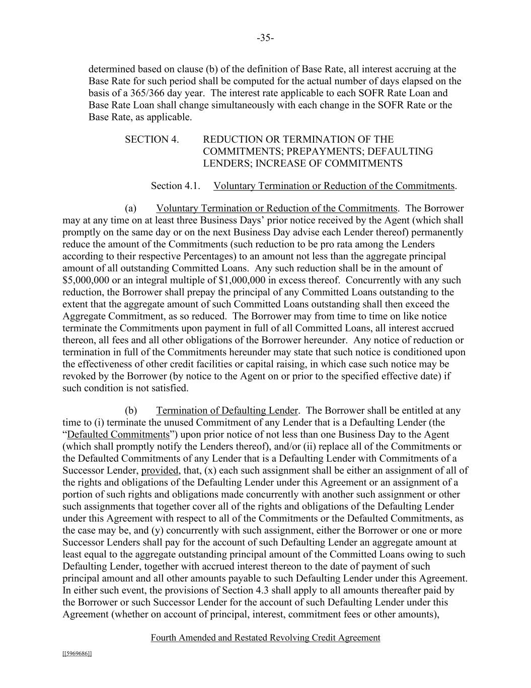 -35- Fourth Amended and Restated Revolving Credit Agreement [[5969686]] determined based on clause (b) of the definition of Base Rate, all interest accruing at the Base Rate for such period shall be computed for the actual number of days elapsed on the basis of a 365/366 day year. The interest rate applicable to each SOFR Rate Loan and Base Rate Loan shall change simultaneously with each change in the SOFR Rate or the Base Rate, as applicable. SECTION 4. REDUCTION OR TERMINATION OF THE COMMITMENTS; PREPAYMENTS; DEFAULTING LENDERS; INCREASE OF COMMITMENTS Section 4.1. Voluntary Termination or Reduction of the Commitments. (a) Voluntary Termination or Reduction of the Commitments. The Borrower may at any time on at least three Business Days’ prior notice received by the Agent (which shall promptly on the same day or on the next Business Day advise each Lender thereof) permanently reduce the amount of the Commitments (such reduction to be pro rata among the Lenders according to their respective Percentages) to an amount not less than the aggregate principal amount of all outstanding Committed Loans. Any such reduction shall be in the amount of $5,000,000 or an integral multiple of $1,000,000 in excess thereof. Concurrently with any such reduction, the Borrower shall prepay the principal of any Committed Loans outstanding to the extent that the aggregate amount of such Committed Loans outstanding shall then exceed the Aggregate Commitment, as so reduced. The Borrower may from time to time on like notice terminate the Commitments upon payment in full of all Committed Loans, all interest accrued thereon, all fees and all other obligations of the Borrower hereunder. Any notice of reduction or termination in full of the Commitments hereunder may state that such notice is conditioned upon the effectiveness of other credit facilities or capital raising, in which case such notice may be revoked by the Borrower (by notice to the Agent on or prior to the specified effective date) if such condition is not satisfied. (b) Termination of Defaulting Lender. The Borrower shall be entitled at any time to (i) terminate the unused Commitment of any Lender that is a Defaulting Lender (the “Defaulted Commitments”) upon prior notice of not less than one Business Day to the Agent (which shall promptly notify the Lenders thereof), and/or (ii) replace all of the Commitments or the Defaulted Commitments of any Lender that is a Defaulting Lender with Commitments of a Successor Lender, provided, that, (x) each such assignment shall be either an assignment of all of the rights and obligations of the Defaulting Lender under this Agreement or an assignment of a portion of such rights and obligations made concurrently with another such assignment or other such assignments that together cover all of the rights and obligations of the Defaulting Lender under this Agreement with respect to all of the Commitments or the Defaulted Commitments, as the case may be, and (y) concurrently with such assignment, either the Borrower or one or more Successor Lenders shall pay for the account of such Defaulting Lender an aggregate amount at least equal to the aggregate outstanding principal amount of the Committed Loans owing to such Defaulting Lender, together with accrued interest thereon to the date of payment of such principal amount and all other amounts payable to such Defaulting Lender under this Agreement. In either such event, the provisions of Section 4.3 shall apply to all amounts thereafter paid by the Borrower or such Successor Lender for the account of such Defaulting Lender under this Agreement (whether on account of principal, interest, commitment fees or other amounts),