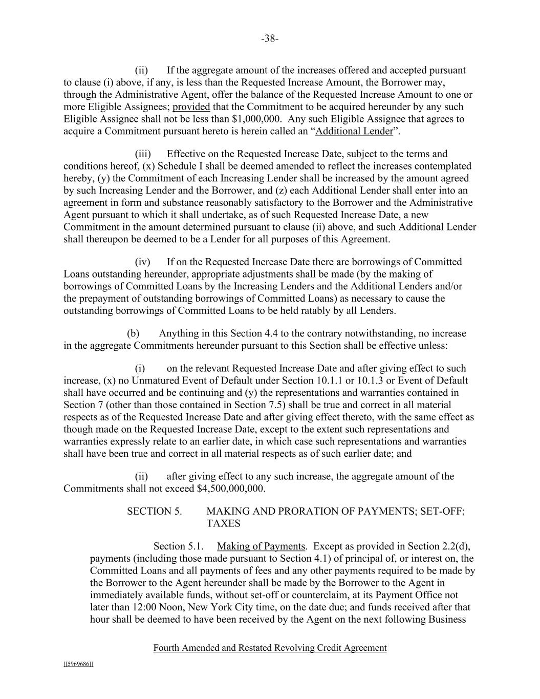 -38- Fourth Amended and Restated Revolving Credit Agreement [[5969686]] (ii) If the aggregate amount of the increases offered and accepted pursuant to clause (i) above, if any, is less than the Requested Increase Amount, the Borrower may, through the Administrative Agent, offer the balance of the Requested Increase Amount to one or more Eligible Assignees; provided that the Commitment to be acquired hereunder by any such Eligible Assignee shall not be less than $1,000,000. Any such Eligible Assignee that agrees to acquire a Commitment pursuant hereto is herein called an “Additional Lender”. (iii) Effective on the Requested Increase Date, subject to the terms and conditions hereof, (x) Schedule I shall be deemed amended to reflect the increases contemplated hereby, (y) the Commitment of each Increasing Lender shall be increased by the amount agreed by such Increasing Lender and the Borrower, and (z) each Additional Lender shall enter into an agreement in form and substance reasonably satisfactory to the Borrower and the Administrative Agent pursuant to which it shall undertake, as of such Requested Increase Date, a new Commitment in the amount determined pursuant to clause (ii) above, and such Additional Lender shall thereupon be deemed to be a Lender for all purposes of this Agreement. (iv) If on the Requested Increase Date there are borrowings of Committed Loans outstanding hereunder, appropriate adjustments shall be made (by the making of borrowings of Committed Loans by the Increasing Lenders and the Additional Lenders and/or the prepayment of outstanding borrowings of Committed Loans) as necessary to cause the outstanding borrowings of Committed Loans to be held ratably by all Lenders. (b) Anything in this Section 4.4 to the contrary notwithstanding, no increase in the aggregate Commitments hereunder pursuant to this Section shall be effective unless: (i) on the relevant Requested Increase Date and after giving effect to such increase, (x) no Unmatured Event of Default under Section 10.1.1 or 10.1.3 or Event of Default shall have occurred and be continuing and (y) the representations and warranties contained in Section 7 (other than those contained in Section 7.5) shall be true and correct in all material respects as of the Requested Increase Date and after giving effect thereto, with the same effect as though made on the Requested Increase Date, except to the extent such representations and warranties expressly relate to an earlier date, in which case such representations and warranties shall have been true and correct in all material respects as of such earlier date; and (ii) after giving effect to any such increase, the aggregate amount of the Commitments shall not exceed $4,500,000,000. SECTION 5. MAKING AND PRORATION OF PAYMENTS; SET-OFF; TAXES Section 5.1. Making of Payments. Except as provided in Section 2.2(d), payments (including those made pursuant to Section 4.1) of principal of, or interest on, the Committed Loans and all payments of fees and any other payments required to be made by the Borrower to the Agent hereunder shall be made by the Borrower to the Agent in immediately available funds, without set-off or counterclaim, at its Payment Office not later than 12:00 Noon, New York City time, on the date due; and funds received after that hour shall be deemed to have been received by the Agent on the next following Business