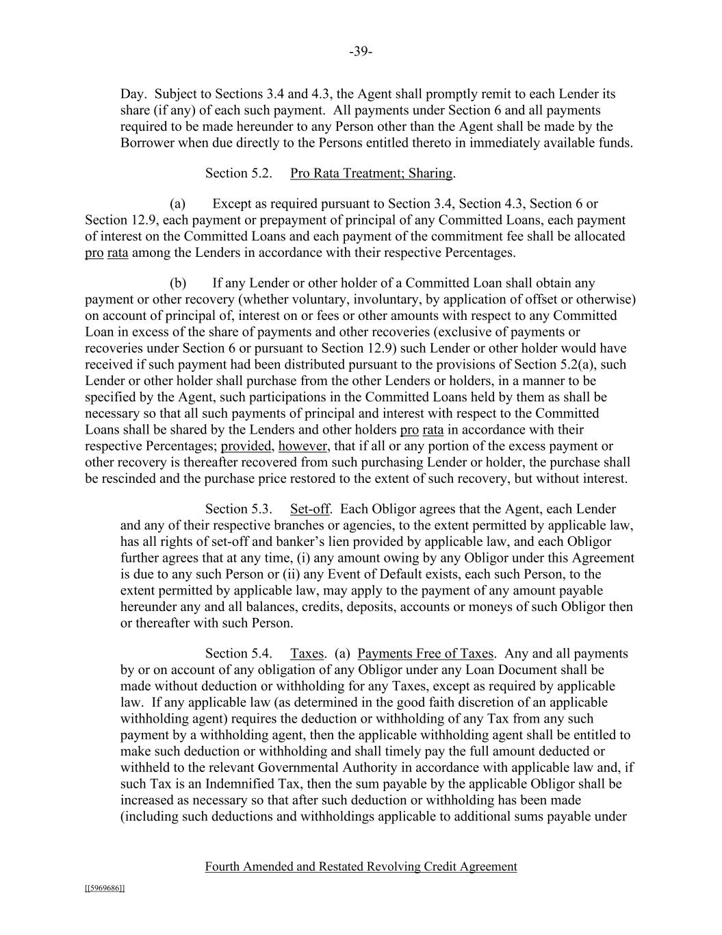 -39- Fourth Amended and Restated Revolving Credit Agreement [[5969686]] Day. Subject to Sections 3.4 and 4.3, the Agent shall promptly remit to each Lender its share (if any) of each such payment. All payments under Section 6 and all payments required to be made hereunder to any Person other than the Agent shall be made by the Borrower when due directly to the Persons entitled thereto in immediately available funds. Section 5.2. Pro Rata Treatment; Sharing. (a) Except as required pursuant to Section 3.4, Section 4.3, Section 6 or Section 12.9, each payment or prepayment of principal of any Committed Loans, each payment of interest on the Committed Loans and each payment of the commitment fee shall be allocated pro rata among the Lenders in accordance with their respective Percentages. (b) If any Lender or other holder of a Committed Loan shall obtain any payment or other recovery (whether voluntary, involuntary, by application of offset or otherwise) on account of principal of, interest on or fees or other amounts with respect to any Committed Loan in excess of the share of payments and other recoveries (exclusive of payments or recoveries under Section 6 or pursuant to Section 12.9) such Lender or other holder would have received if such payment had been distributed pursuant to the provisions of Section 5.2(a), such Lender or other holder shall purchase from the other Lenders or holders, in a manner to be specified by the Agent, such participations in the Committed Loans held by them as shall be necessary so that all such payments of principal and interest with respect to the Committed Loans shall be shared by the Lenders and other holders pro rata in accordance with their respective Percentages; provided, however, that if all or any portion of the excess payment or other recovery is thereafter recovered from such purchasing Lender or holder, the purchase shall be rescinded and the purchase price restored to the extent of such recovery, but without interest. Section 5.3. Set-off. Each Obligor agrees that the Agent, each Lender and any of their respective branches or agencies, to the extent permitted by applicable law, has all rights of set-off and banker’s lien provided by applicable law, and each Obligor further agrees that at any time, (i) any amount owing by any Obligor under this Agreement is due to any such Person or (ii) any Event of Default exists, each such Person, to the extent permitted by applicable law, may apply to the payment of any amount payable hereunder any and all balances, credits, deposits, accounts or moneys of such Obligor then or thereafter with such Person. Section 5.4. Taxes. (a) Payments Free of Taxes. Any and all payments by or on account of any obligation of any Obligor under any Loan Document shall be made without deduction or withholding for any Taxes, except as required by applicable law. If any applicable law (as determined in the good faith discretion of an applicable withholding agent) requires the deduction or withholding of any Tax from any such payment by a withholding agent, then the applicable withholding agent shall be entitled to make such deduction or withholding and shall timely pay the full amount deducted or withheld to the relevant Governmental Authority in accordance with applicable law and, if such Tax is an Indemnified Tax, then the sum payable by the applicable Obligor shall be increased as necessary so that after such deduction or withholding has been made (including such deductions and withholdings applicable to additional sums payable under