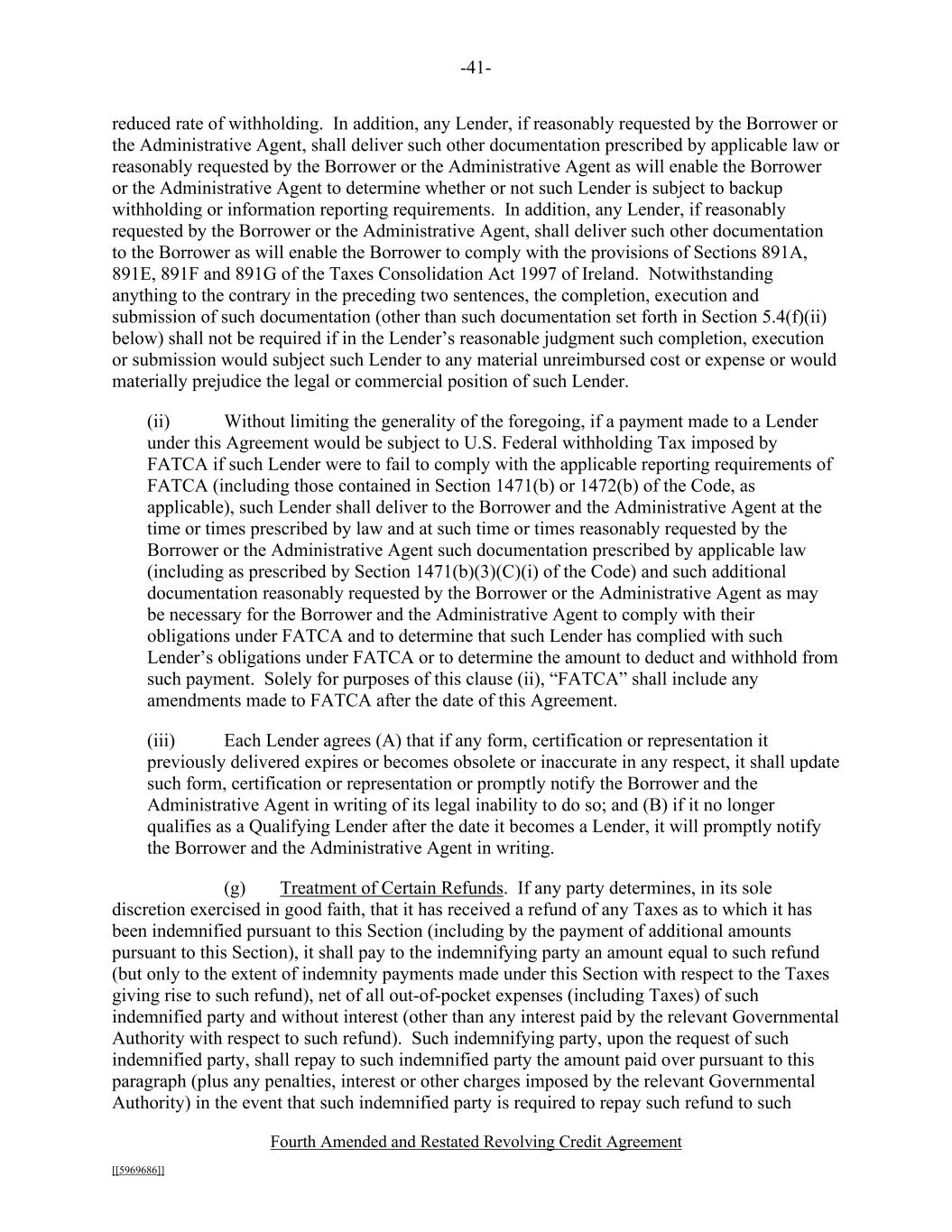 -41- Fourth Amended and Restated Revolving Credit Agreement [[5969686]] reduced rate of withholding. In addition, any Lender, if reasonably requested by the Borrower or the Administrative Agent, shall deliver such other documentation prescribed by applicable law or reasonably requested by the Borrower or the Administrative Agent as will enable the Borrower or the Administrative Agent to determine whether or not such Lender is subject to backup withholding or information reporting requirements. In addition, any Lender, if reasonably requested by the Borrower or the Administrative Agent, shall deliver such other documentation to the Borrower as will enable the Borrower to comply with the provisions of Sections 891A, 891E, 891F and 891G of the Taxes Consolidation Act 1997 of Ireland. Notwithstanding anything to the contrary in the preceding two sentences, the completion, execution and submission of such documentation (other than such documentation set forth in Section 5.4(f)(ii) below) shall not be required if in the Lender’s reasonable judgment such completion, execution or submission would subject such Lender to any material unreimbursed cost or expense or would materially prejudice the legal or commercial position of such Lender. (ii) Without limiting the generality of the foregoing, if a payment made to a Lender under this Agreement would be subject to U.S. Federal withholding Tax imposed by FATCA if such Lender were to fail to comply with the applicable reporting requirements of FATCA (including those contained in Section 1471(b) or 1472(b) of the Code, as applicable), such Lender shall deliver to the Borrower and the Administrative Agent at the time or times prescribed by law and at such time or times reasonably requested by the Borrower or the Administrative Agent such documentation prescribed by applicable law (including as prescribed by Section 1471(b)(3)(C)(i) of the Code) and such additional documentation reasonably requested by the Borrower or the Administrative Agent as may be necessary for the Borrower and the Administrative Agent to comply with their obligations under FATCA and to determine that such Lender has complied with such Lender’s obligations under FATCA or to determine the amount to deduct and withhold from such payment. Solely for purposes of this clause (ii), “FATCA” shall include any amendments made to FATCA after the date of this Agreement. (iii) Each Lender agrees (A) that if any form, certification or representation it previously delivered expires or becomes obsolete or inaccurate in any respect, it shall update such form, certification or representation or promptly notify the Borrower and the Administrative Agent in writing of its legal inability to do so; and (B) if it no longer qualifies as a Qualifying Lender after the date it becomes a Lender, it will promptly notify the Borrower and the Administrative Agent in writing. (g) Treatment of Certain Refunds. If any party determines, in its sole discretion exercised in good faith, that it has received a refund of any Taxes as to which it has been indemnified pursuant to this Section (including by the payment of additional amounts pursuant to this Section), it shall pay to the indemnifying party an amount equal to such refund (but only to the extent of indemnity payments made under this Section with respect to the Taxes giving rise to such refund), net of all out-of-pocket expenses (including Taxes) of such indemnified party and without interest (other than any interest paid by the relevant Governmental Authority with respect to such refund). Such indemnifying party, upon the request of such indemnified party, shall repay to such indemnified party the amount paid over pursuant to this paragraph (plus any penalties, interest or other charges imposed by the relevant Governmental Authority) in the event that such indemnified party is required to repay such refund to such