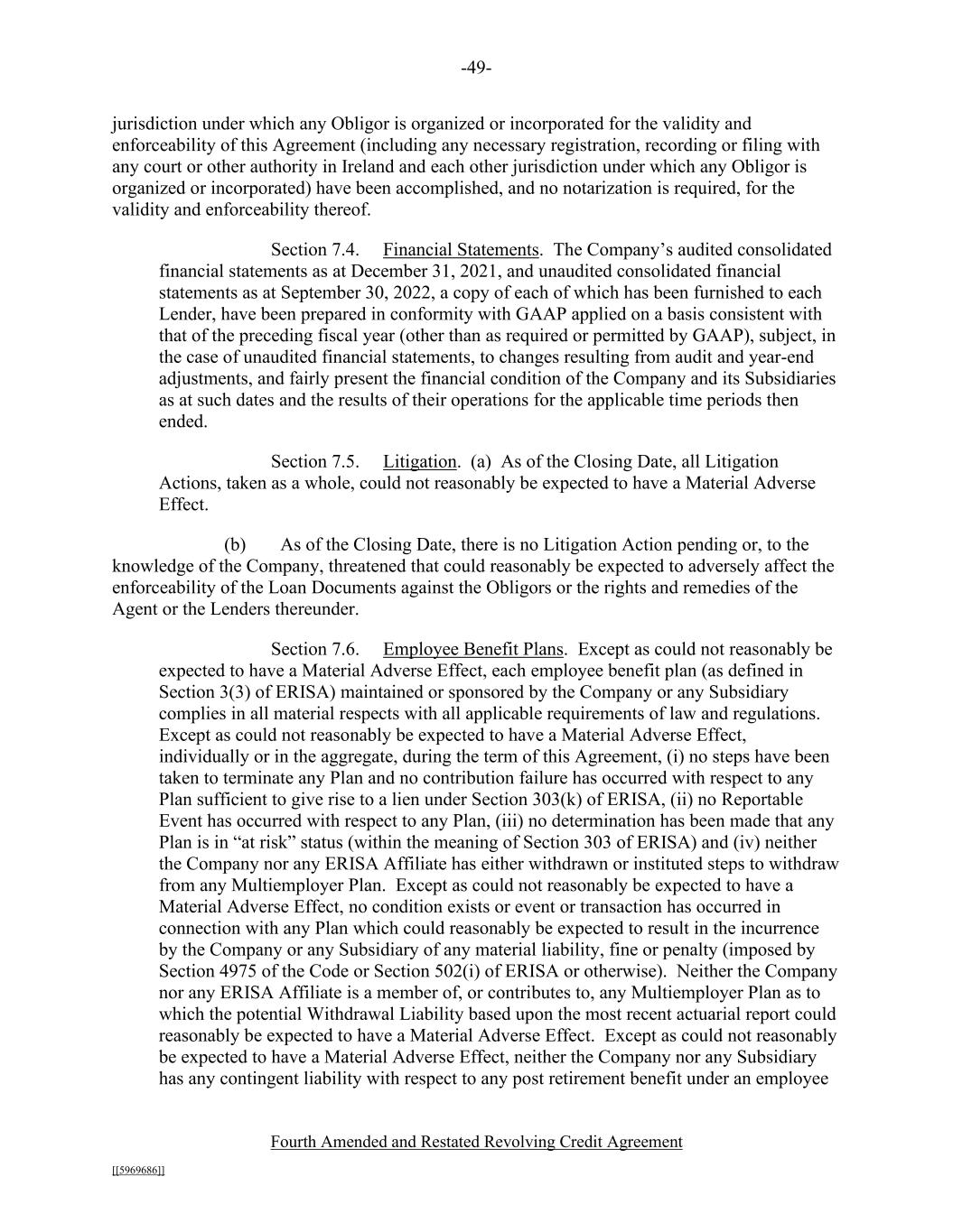 -49- Fourth Amended and Restated Revolving Credit Agreement [[5969686]] jurisdiction under which any Obligor is organized or incorporated for the validity and enforceability of this Agreement (including any necessary registration, recording or filing with any court or other authority in Ireland and each other jurisdiction under which any Obligor is organized or incorporated) have been accomplished, and no notarization is required, for the validity and enforceability thereof. Section 7.4. Financial Statements. The Company’s audited consolidated financial statements as at December 31, 2021, and unaudited consolidated financial statements as at September 30, 2022, a copy of each of which has been furnished to each Lender, have been prepared in conformity with GAAP applied on a basis consistent with that of the preceding fiscal year (other than as required or permitted by GAAP), subject, in the case of unaudited financial statements, to changes resulting from audit and year-end adjustments, and fairly present the financial condition of the Company and its Subsidiaries as at such dates and the results of their operations for the applicable time periods then ended. Section 7.5. Litigation. (a) As of the Closing Date, all Litigation Actions, taken as a whole, could not reasonably be expected to have a Material Adverse Effect. (b) As of the Closing Date, there is no Litigation Action pending or, to the knowledge of the Company, threatened that could reasonably be expected to adversely affect the enforceability of the Loan Documents against the Obligors or the rights and remedies of the Agent or the Lenders thereunder. Section 7.6. Employee Benefit Plans. Except as could not reasonably be expected to have a Material Adverse Effect, each employee benefit plan (as defined in Section 3(3) of ERISA) maintained or sponsored by the Company or any Subsidiary complies in all material respects with all applicable requirements of law and regulations. Except as could not reasonably be expected to have a Material Adverse Effect, individually or in the aggregate, during the term of this Agreement, (i) no steps have been taken to terminate any Plan and no contribution failure has occurred with respect to any Plan sufficient to give rise to a lien under Section 303(k) of ERISA, (ii) no Reportable Event has occurred with respect to any Plan, (iii) no determination has been made that any Plan is in “at risk” status (within the meaning of Section 303 of ERISA) and (iv) neither the Company nor any ERISA Affiliate has either withdrawn or instituted steps to withdraw from any Multiemployer Plan. Except as could not reasonably be expected to have a Material Adverse Effect, no condition exists or event or transaction has occurred in connection with any Plan which could reasonably be expected to result in the incurrence by the Company or any Subsidiary of any material liability, fine or penalty (imposed by Section 4975 of the Code or Section 502(i) of ERISA or otherwise). Neither the Company nor any ERISA Affiliate is a member of, or contributes to, any Multiemployer Plan as to which the potential Withdrawal Liability based upon the most recent actuarial report could reasonably be expected to have a Material Adverse Effect. Except as could not reasonably be expected to have a Material Adverse Effect, neither the Company nor any Subsidiary has any contingent liability with respect to any post retirement benefit under an employee