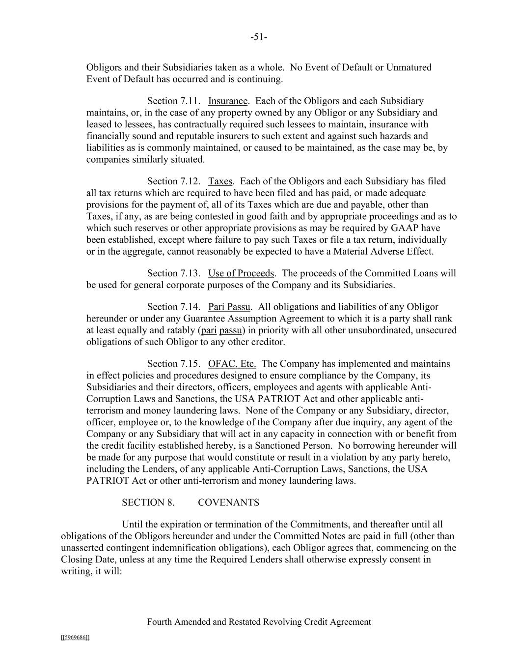 -51- Fourth Amended and Restated Revolving Credit Agreement [[5969686]] Obligors and their Subsidiaries taken as a whole. No Event of Default or Unmatured Event of Default has occurred and is continuing. Section 7.11. Insurance. Each of the Obligors and each Subsidiary maintains, or, in the case of any property owned by any Obligor or any Subsidiary and leased to lessees, has contractually required such lessees to maintain, insurance with financially sound and reputable insurers to such extent and against such hazards and liabilities as is commonly maintained, or caused to be maintained, as the case may be, by companies similarly situated. Section 7.12. Taxes. Each of the Obligors and each Subsidiary has filed all tax returns which are required to have been filed and has paid, or made adequate provisions for the payment of, all of its Taxes which are due and payable, other than Taxes, if any, as are being contested in good faith and by appropriate proceedings and as to which such reserves or other appropriate provisions as may be required by GAAP have been established, except where failure to pay such Taxes or file a tax return, individually or in the aggregate, cannot reasonably be expected to have a Material Adverse Effect. Section 7.13. Use of Proceeds. The proceeds of the Committed Loans will be used for general corporate purposes of the Company and its Subsidiaries. Section 7.14. Pari Passu. All obligations and liabilities of any Obligor hereunder or under any Guarantee Assumption Agreement to which it is a party shall rank at least equally and ratably (pari passu) in priority with all other unsubordinated, unsecured obligations of such Obligor to any other creditor. Section 7.15. OFAC, Etc. The Company has implemented and maintains in effect policies and procedures designed to ensure compliance by the Company, its Subsidiaries and their directors, officers, employees and agents with applicable Anti- Corruption Laws and Sanctions, the USA PATRIOT Act and other applicable anti- terrorism and money laundering laws. None of the Company or any Subsidiary, director, officer, employee or, to the knowledge of the Company after due inquiry, any agent of the Company or any Subsidiary that will act in any capacity in connection with or benefit from the credit facility established hereby, is a Sanctioned Person. No borrowing hereunder will be made for any purpose that would constitute or result in a violation by any party hereto, including the Lenders, of any applicable Anti-Corruption Laws, Sanctions, the USA PATRIOT Act or other anti-terrorism and money laundering laws. SECTION 8. COVENANTS Until the expiration or termination of the Commitments, and thereafter until all obligations of the Obligors hereunder and under the Committed Notes are paid in full (other than unasserted contingent indemnification obligations), each Obligor agrees that, commencing on the Closing Date, unless at any time the Required Lenders shall otherwise expressly consent in writing, it will: