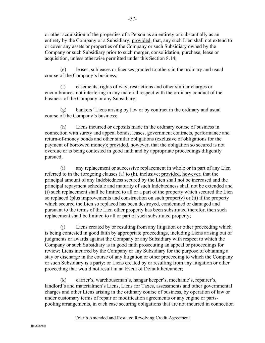 -57- Fourth Amended and Restated Revolving Credit Agreement [[5969686]] or other acquisition of the properties of a Person as an entirety or substantially as an entirety by the Company or a Subsidiary; provided, that, any such Lien shall not extend to or cover any assets or properties of the Company or such Subsidiary owned by the Company or such Subsidiary prior to such merger, consolidation, purchase, lease or acquisition, unless otherwise permitted under this Section 8.14; (e) leases, subleases or licenses granted to others in the ordinary and usual course of the Company’s business; (f) easements, rights of way, restrictions and other similar charges or encumbrances not interfering in any material respect with the ordinary conduct of the business of the Company or any Subsidiary; (g) bankers’ Liens arising by law or by contract in the ordinary and usual course of the Company’s business; (h) Liens incurred or deposits made in the ordinary course of business in connection with surety and appeal bonds, leases, government contracts, performance and return-of-money bonds and other similar obligations (exclusive of obligations for the payment of borrowed money); provided, however, that the obligation so secured is not overdue or is being contested in good faith and by appropriate proceedings diligently pursued; (i) any replacement or successive replacement in whole or in part of any Lien referred to in the foregoing clauses (a) to (h), inclusive; provided, however, that the principal amount of any Indebtedness secured by the Lien shall not be increased and the principal repayment schedule and maturity of such Indebtedness shall not be extended and (i) such replacement shall be limited to all or a part of the property which secured the Lien so replaced (plus improvements and construction on such property) or (ii) if the property which secured the Lien so replaced has been destroyed, condemned or damaged and pursuant to the terms of the Lien other property has been substituted therefor, then such replacement shall be limited to all or part of such substituted property; (j) Liens created by or resulting from any litigation or other proceeding which is being contested in good faith by appropriate proceedings, including Liens arising out of judgments or awards against the Company or any Subsidiary with respect to which the Company or such Subsidiary is in good faith prosecuting an appeal or proceedings for review; Liens incurred by the Company or any Subsidiary for the purpose of obtaining a stay or discharge in the course of any litigation or other proceeding to which the Company or such Subsidiary is a party; or Liens created by or resulting from any litigation or other proceeding that would not result in an Event of Default hereunder; (k) carrier’s, warehouseman’s, hangar keeper’s, mechanic’s, repairer’s, landlord’s and materialmen’s Liens, Liens for Taxes, assessments and other governmental charges and other Liens arising in the ordinary course of business, by operation of law or under customary terms of repair or modification agreements or any engine or parts- pooling arrangements, in each case securing obligations that are not incurred in connection