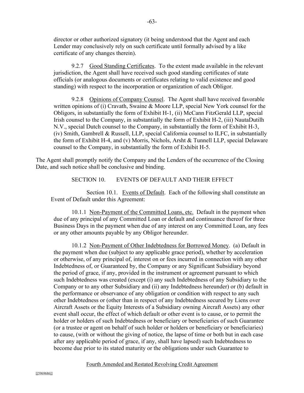 -63- Fourth Amended and Restated Revolving Credit Agreement [[5969686]] director or other authorized signatory (it being understood that the Agent and each Lender may conclusively rely on such certificate until formally advised by a like certificate of any changes therein). 9.2.7 Good Standing Certificates. To the extent made available in the relevant jurisdiction, the Agent shall have received such good standing certificates of state officials (or analogous documents or certificates relating to valid existence and good standing) with respect to the incorporation or organization of each Obligor. 9.2.8 Opinions of Company Counsel. The Agent shall have received favorable written opinions of (i) Cravath, Swaine & Moore LLP, special New York counsel for the Obligors, in substantially the form of Exhibit H-1, (ii) McCann FitzGerald LLP, special Irish counsel to the Company, in substantially the form of Exhibit H-2, (iii) NautaDutilh N.V., special Dutch counsel to the Company, in substantially the form of Exhibit H-3, (iv) Smith, Gambrell & Russell, LLP, special California counsel to ILFC, in substantially the form of Exhibit H-4, and (v) Morris, Nichols, Arsht & Tunnell LLP, special Delaware counsel to the Company, in substantially the form of Exhibit H-5. The Agent shall promptly notify the Company and the Lenders of the occurrence of the Closing Date, and such notice shall be conclusive and binding. SECTION 10. EVENTS OF DEFAULT AND THEIR EFFECT Section 10.1. Events of Default. Each of the following shall constitute an Event of Default under this Agreement: 10.1.1 Non-Payment of the Committed Loans, etc. Default in the payment when due of any principal of any Committed Loan or default and continuance thereof for three Business Days in the payment when due of any interest on any Committed Loan, any fees or any other amounts payable by any Obligor hereunder. 10.1.2 Non-Payment of Other Indebtedness for Borrowed Money. (a) Default in the payment when due (subject to any applicable grace period), whether by acceleration or otherwise, of any principal of, interest on or fees incurred in connection with any other Indebtedness of, or Guaranteed by, the Company or any Significant Subsidiary beyond the period of grace, if any, provided in the instrument or agreement pursuant to which such Indebtedness was created (except (i) any such Indebtedness of any Subsidiary to the Company or to any other Subsidiary and (ii) any Indebtedness hereunder) or (b) default in the performance or observance of any obligation or condition with respect to any such other Indebtedness or (other than in respect of any Indebtedness secured by Liens over Aircraft Assets or the Equity Interests of a Subsidiary owning Aircraft Assets) any other event shall occur, the effect of which default or other event is to cause, or to permit the holder or holders of such Indebtedness or beneficiary or beneficiaries of such Guarantee (or a trustee or agent on behalf of such holder or holders or beneficiary or beneficiaries) to cause, (with or without the giving of notice, the lapse of time or both but in each case after any applicable period of grace, if any, shall have lapsed) such Indebtedness to become due prior to its stated maturity or the obligations under such Guarantee to
