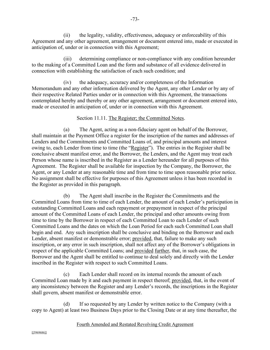 -73- Fourth Amended and Restated Revolving Credit Agreement [[5969686]] (ii) the legality, validity, effectiveness, adequacy or enforceability of this Agreement and any other agreement, arrangement or document entered into, made or executed in anticipation of, under or in connection with this Agreement; (iii) determining compliance or non-compliance with any condition hereunder to the making of a Committed Loan and the form and substance of all evidence delivered in connection with establishing the satisfaction of each such condition; and (iv) the adequacy, accuracy and/or completeness of the Information Memorandum and any other information delivered by the Agent, any other Lender or by any of their respective Related Parties under or in connection with this Agreement, the transactions contemplated hereby and thereby or any other agreement, arrangement or document entered into, made or executed in anticipation of, under or in connection with this Agreement. Section 11.11. The Register; the Committed Notes. (a) The Agent, acting as a non-fiduciary agent on behalf of the Borrower, shall maintain at the Payment Office a register for the inscription of the names and addresses of Lenders and the Commitments and Committed Loans of, and principal amounts and interest owing to, each Lender from time to time (the “Register”). The entries in the Register shall be conclusive absent manifest error, and the Borrower, the Lenders, and the Agent may treat each Person whose name is inscribed in the Register as a Lender hereunder for all purposes of this Agreement. The Register shall be available for inspection by the Company, the Borrower, the Agent, or any Lender at any reasonable time and from time to time upon reasonable prior notice. No assignment shall be effective for purposes of this Agreement unless it has been recorded in the Register as provided in this paragraph. (b) The Agent shall inscribe in the Register the Commitments and the Committed Loans from time to time of each Lender, the amount of each Lender’s participation in outstanding Committed Loans and each repayment or prepayment in respect of the principal amount of the Committed Loans of each Lender, the principal and other amounts owing from time to time by the Borrower in respect of each Committed Loan to each Lender of such Committed Loans and the dates on which the Loan Period for each such Committed Loan shall begin and end. Any such inscription shall be conclusive and binding on the Borrower and each Lender, absent manifest or demonstrable error; provided, that, failure to make any such inscription, or any error in such inscription, shall not affect any of the Borrower’s obligations in respect of the applicable Committed Loans; and provided further, that, in such case, the Borrower and the Agent shall be entitled to continue to deal solely and directly with the Lender inscribed in the Register with respect to such Committed Loans. (c) Each Lender shall record on its internal records the amount of each Committed Loan made by it and each payment in respect thereof; provided, that, in the event of any inconsistency between the Register and any Lender’s records, the inscriptions in the Register shall govern, absent manifest or demonstrable error. (d) If so requested by any Lender by written notice to the Company (with a copy to Agent) at least two Business Days prior to the Closing Date or at any time thereafter, the