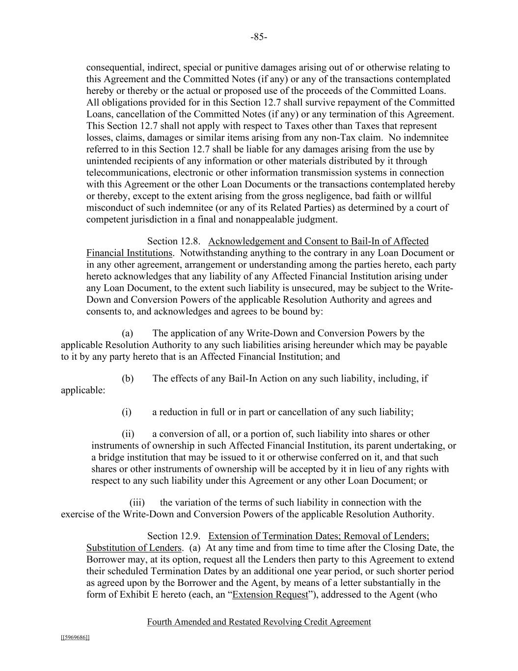 -85- Fourth Amended and Restated Revolving Credit Agreement [[5969686]] consequential, indirect, special or punitive damages arising out of or otherwise relating to this Agreement and the Committed Notes (if any) or any of the transactions contemplated hereby or thereby or the actual or proposed use of the proceeds of the Committed Loans. All obligations provided for in this Section 12.7 shall survive repayment of the Committed Loans, cancellation of the Committed Notes (if any) or any termination of this Agreement. This Section 12.7 shall not apply with respect to Taxes other than Taxes that represent losses, claims, damages or similar items arising from any non-Tax claim. No indemnitee referred to in this Section 12.7 shall be liable for any damages arising from the use by unintended recipients of any information or other materials distributed by it through telecommunications, electronic or other information transmission systems in connection with this Agreement or the other Loan Documents or the transactions contemplated hereby or thereby, except to the extent arising from the gross negligence, bad faith or willful misconduct of such indemnitee (or any of its Related Parties) as determined by a court of competent jurisdiction in a final and nonappealable judgment. Section 12.8. Acknowledgement and Consent to Bail-In of Affected Financial Institutions. Notwithstanding anything to the contrary in any Loan Document or in any other agreement, arrangement or understanding among the parties hereto, each party hereto acknowledges that any liability of any Affected Financial Institution arising under any Loan Document, to the extent such liability is unsecured, may be subject to the Write- Down and Conversion Powers of the applicable Resolution Authority and agrees and consents to, and acknowledges and agrees to be bound by: (a) The application of any Write-Down and Conversion Powers by the applicable Resolution Authority to any such liabilities arising hereunder which may be payable to it by any party hereto that is an Affected Financial Institution; and (b) The effects of any Bail-In Action on any such liability, including, if applicable: (i) a reduction in full or in part or cancellation of any such liability; (ii) a conversion of all, or a portion of, such liability into shares or other instruments of ownership in such Affected Financial Institution, its parent undertaking, or a bridge institution that may be issued to it or otherwise conferred on it, and that such shares or other instruments of ownership will be accepted by it in lieu of any rights with respect to any such liability under this Agreement or any other Loan Document; or (iii) the variation of the terms of such liability in connection with the exercise of the Write-Down and Conversion Powers of the applicable Resolution Authority. Section 12.9. Extension of Termination Dates; Removal of Lenders; Substitution of Lenders. (a) At any time and from time to time after the Closing Date, the Borrower may, at its option, request all the Lenders then party to this Agreement to extend their scheduled Termination Dates by an additional one year period, or such shorter period as agreed upon by the Borrower and the Agent, by means of a letter substantially in the form of Exhibit E hereto (each, an “Extension Request”), addressed to the Agent (who