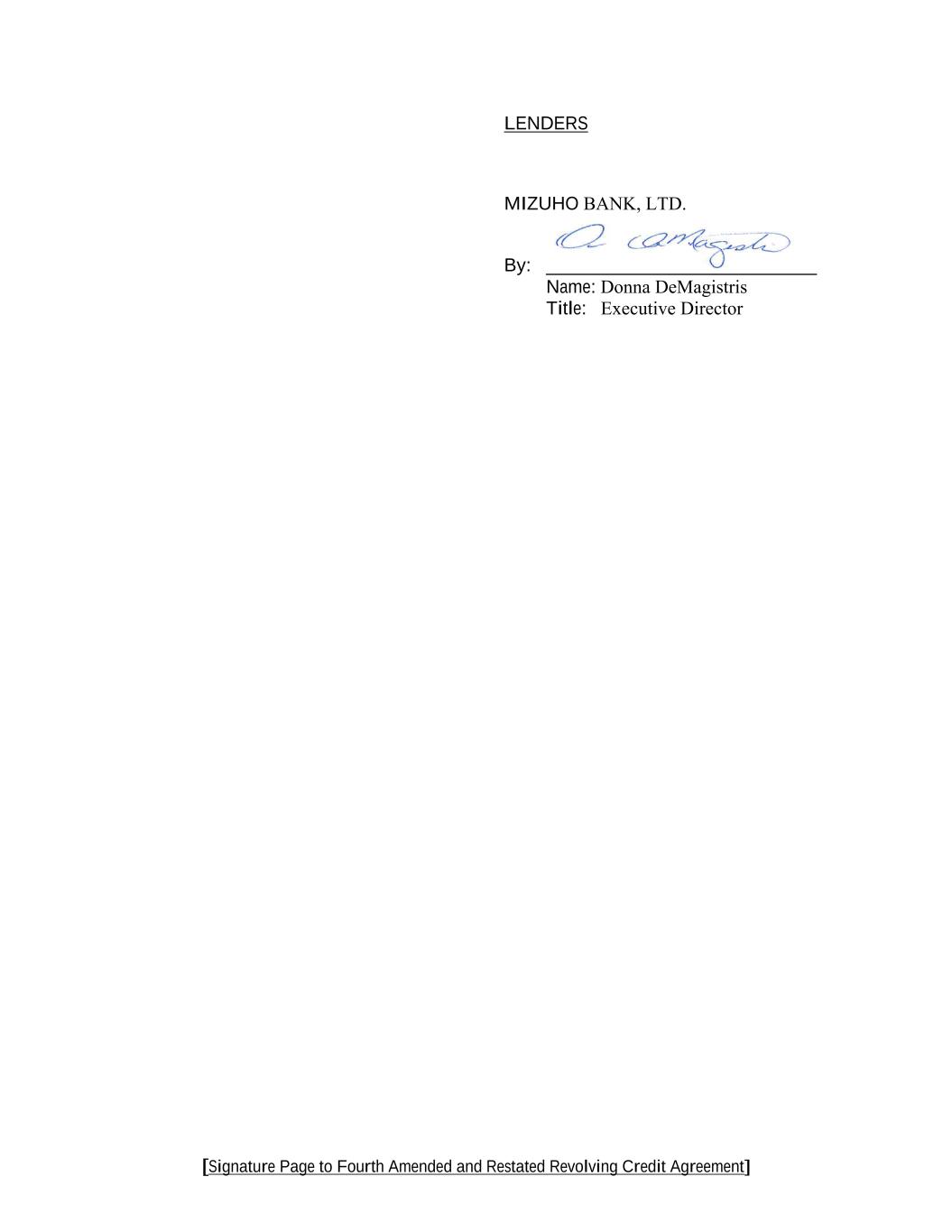 [Signature Page to Fourth Amended and Restated Revolving Credit Agreement] LENDERS MIZUHO BANK, LTD. By: _____________________________ Name: Donna DeMagistris Title: Executive Director