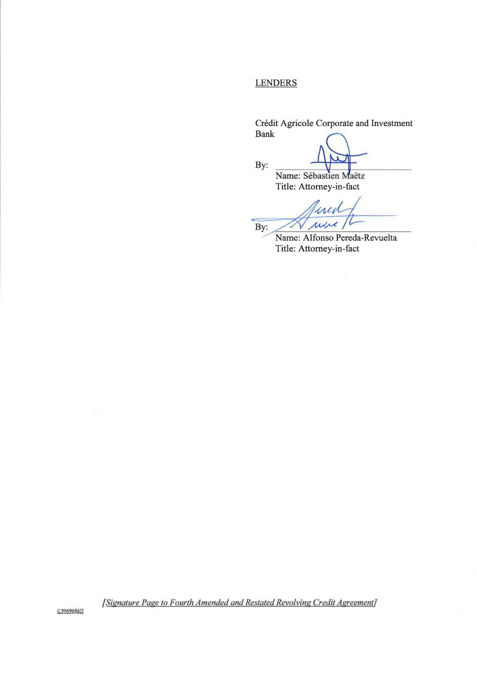LENDERS Crédit Agricole Corporate and Investment Bank By: Name: Sé Title: Attorney-in-fact By: /f/'//-1 Name: Alfonso Pereda-Revuelta Title: Attorney-in-fact rr5969ó86il tS¡snature Pase to Fourfu