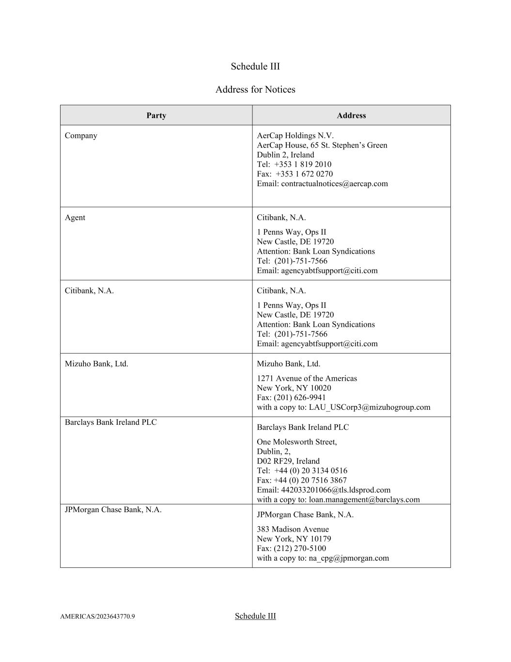 AMERICAS/2023643770.9 Schedule III Schedule III Address for Notices Party Address Company AerCap Holdings N.V. AerCap House, 65 St. Stephen’s Green Dublin 2, Ireland Tel: +353 1 819 2010 Fax: +353 1 672 0270 Email: contractualnotices@aercap.com Agent Citibank, N.A. 1 Penns Way, Ops II New Castle, DE 19720 Attention: Bank Loan Syndications Tel: (201)-751-7566 Email: agencyabtfsupport@citi.com Citibank, N.A. Citibank, N.A. 1 Penns Way, Ops II New Castle, DE 19720 Attention: Bank Loan Syndications Tel: (201)-751-7566 Email: agencyabtfsupport@citi.com Mizuho Bank, Ltd. Mizuho Bank, Ltd. 1271 Avenue of the Americas New York, NY 10020 Fax: (201) 626-9941 with a copy to: LAU_USCorp3@mizuhogroup.com Barclays Bank Ireland PLC Barclays Bank Ireland PLC One Molesworth Street, Dublin, 2, D02 RF29, Ireland Tel: +44 (0) 20 3134 0516 Fax: +44 (0) 20 7516 3867 Email: 442033201066@tls.ldsprod.com with a copy to: loan.management@barclays.com JPMorgan Chase Bank, N.A. JPMorgan Chase Bank, N.A. 383 Madison Avenue New York, NY 10179 Fax: (212) 270-5100 with a copy to: na_cpg@jpmorgan.com